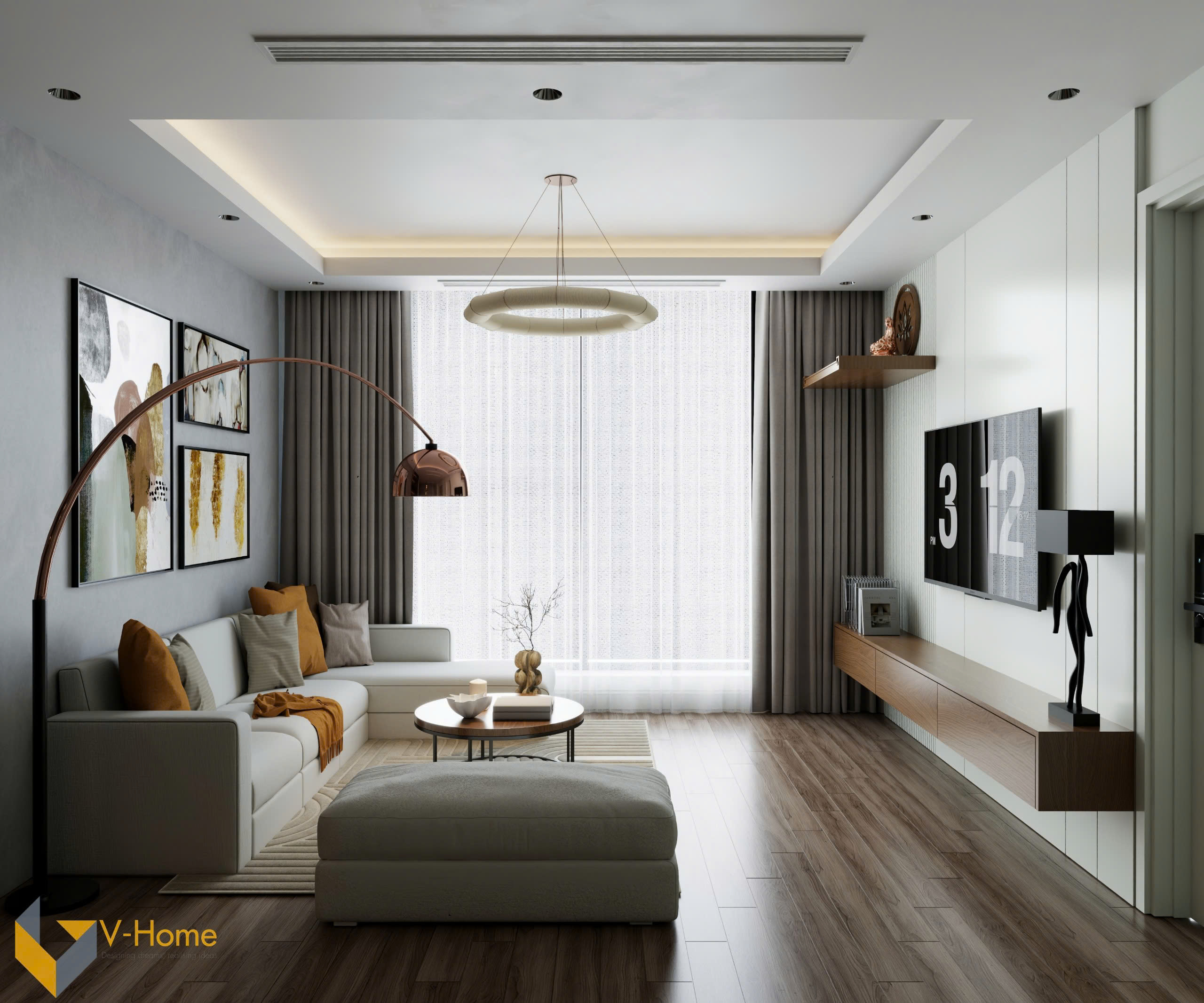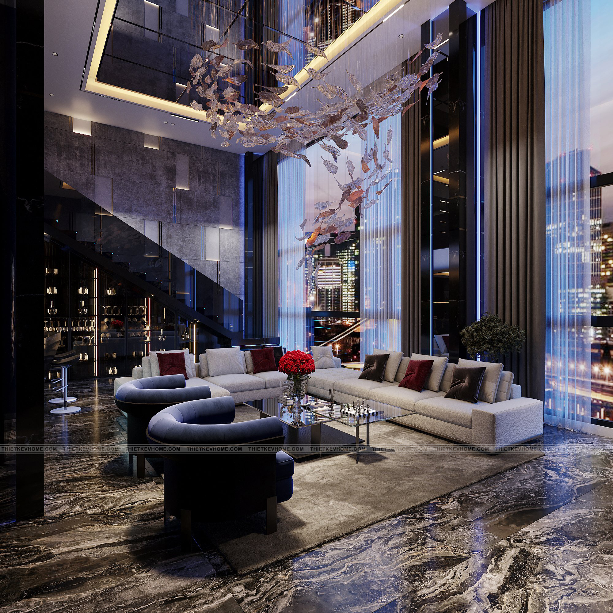 Phòng khách: không gian phong cách nội thất hiện đại – xa hoa Bước vào căn hộ, điểm ấn tượng đầu tiên là chiều cao trần lớn cùng hệ...