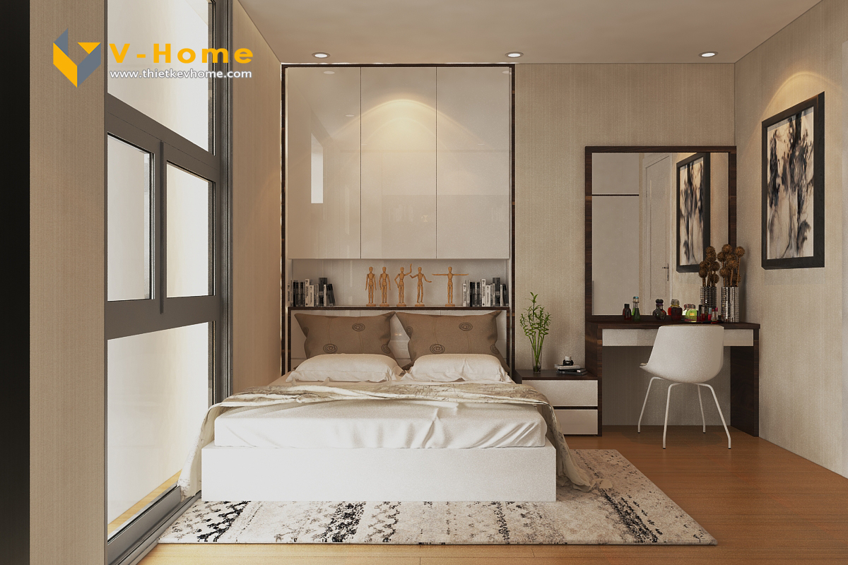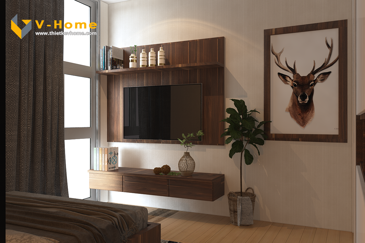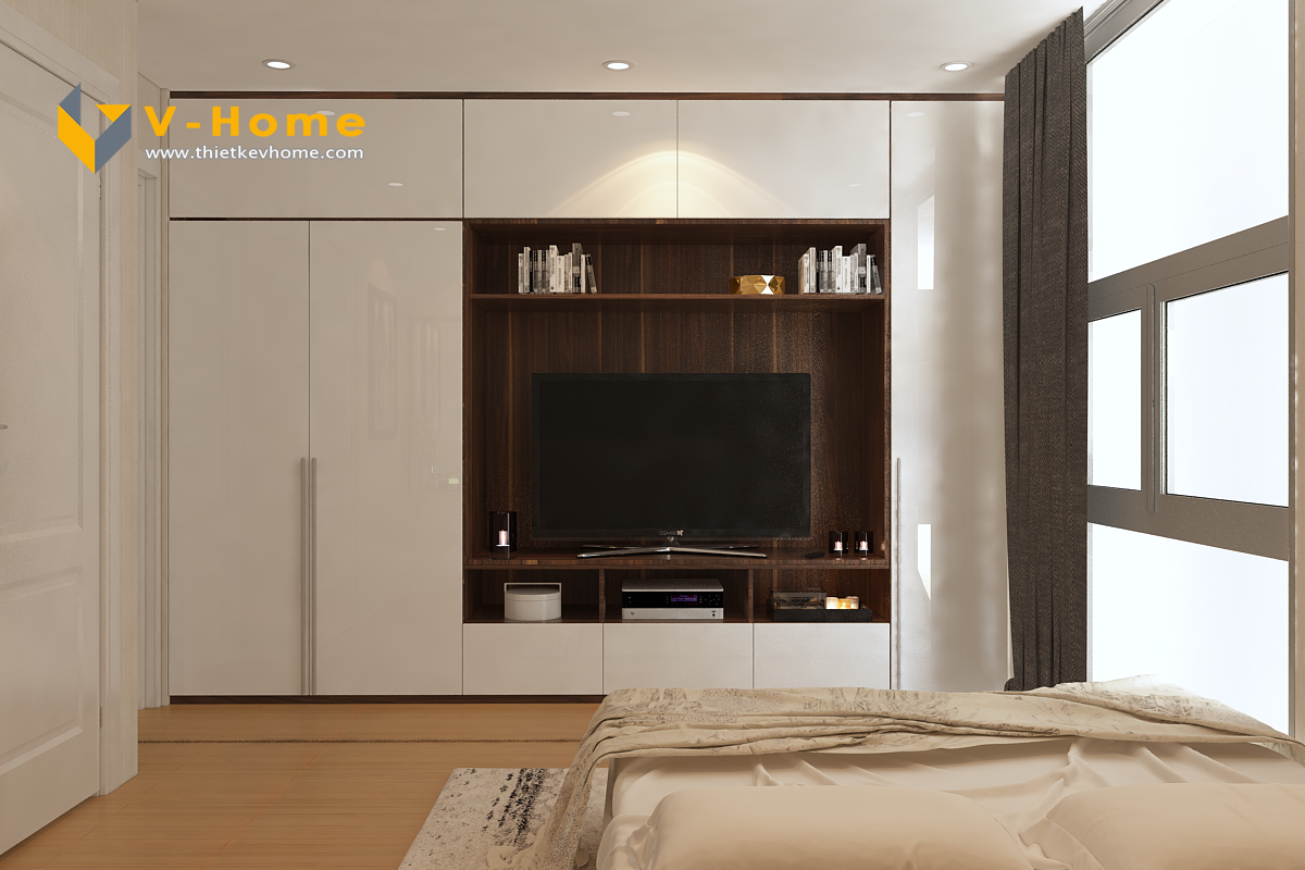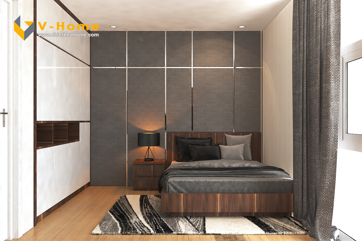 Phòng ngủ master cũng là sự kết hợp màu gỗ óc chó và màu trắng tinh khôi, tuy nhiên được nhấn bởi màu ghi mạnh mẽ mang đến một gian nghỉ ngơi yên tĩnh và gần gũi.