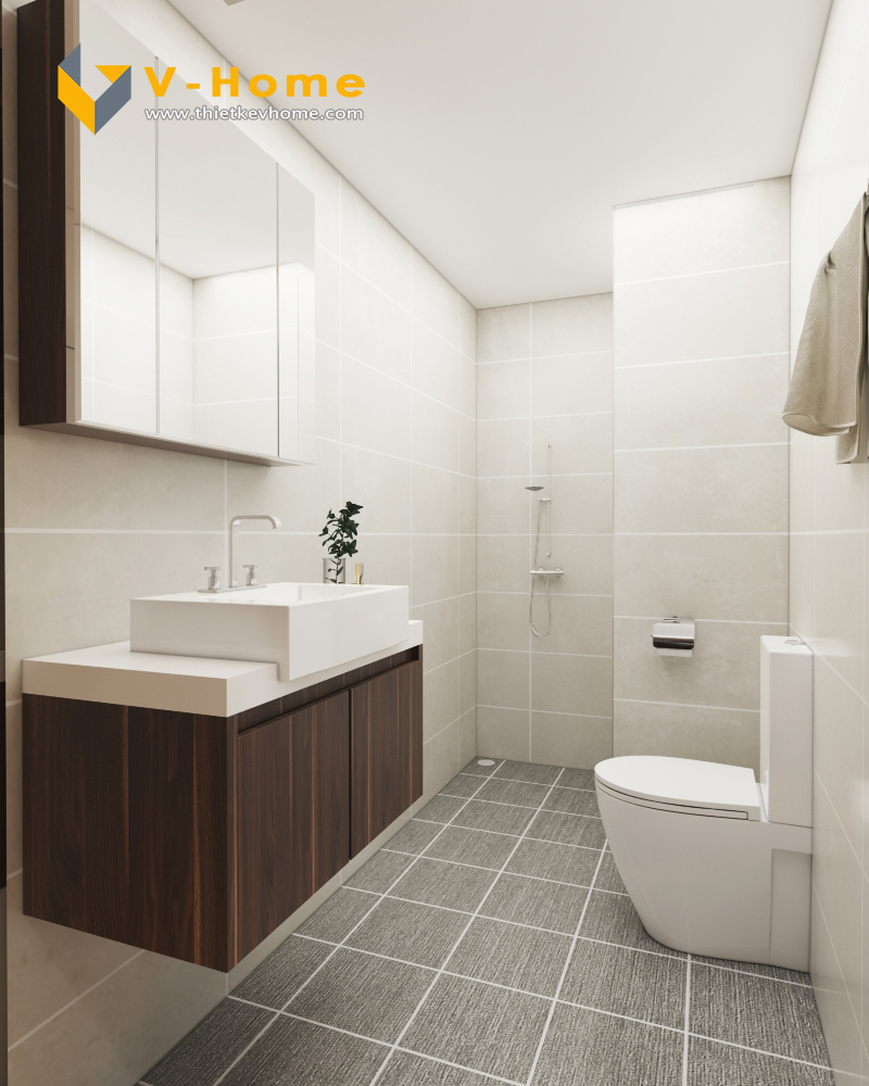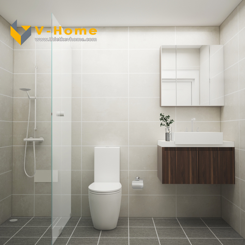 Thiết kế phòng WC đơn giản hiện đại. Phòng WC sử dụng vách kính tắm đứng và hệ tủ có gắn gương giúp không gian phòng tắm trở lên rộng rãi, khô thoáng và sạch sẽ hơn.