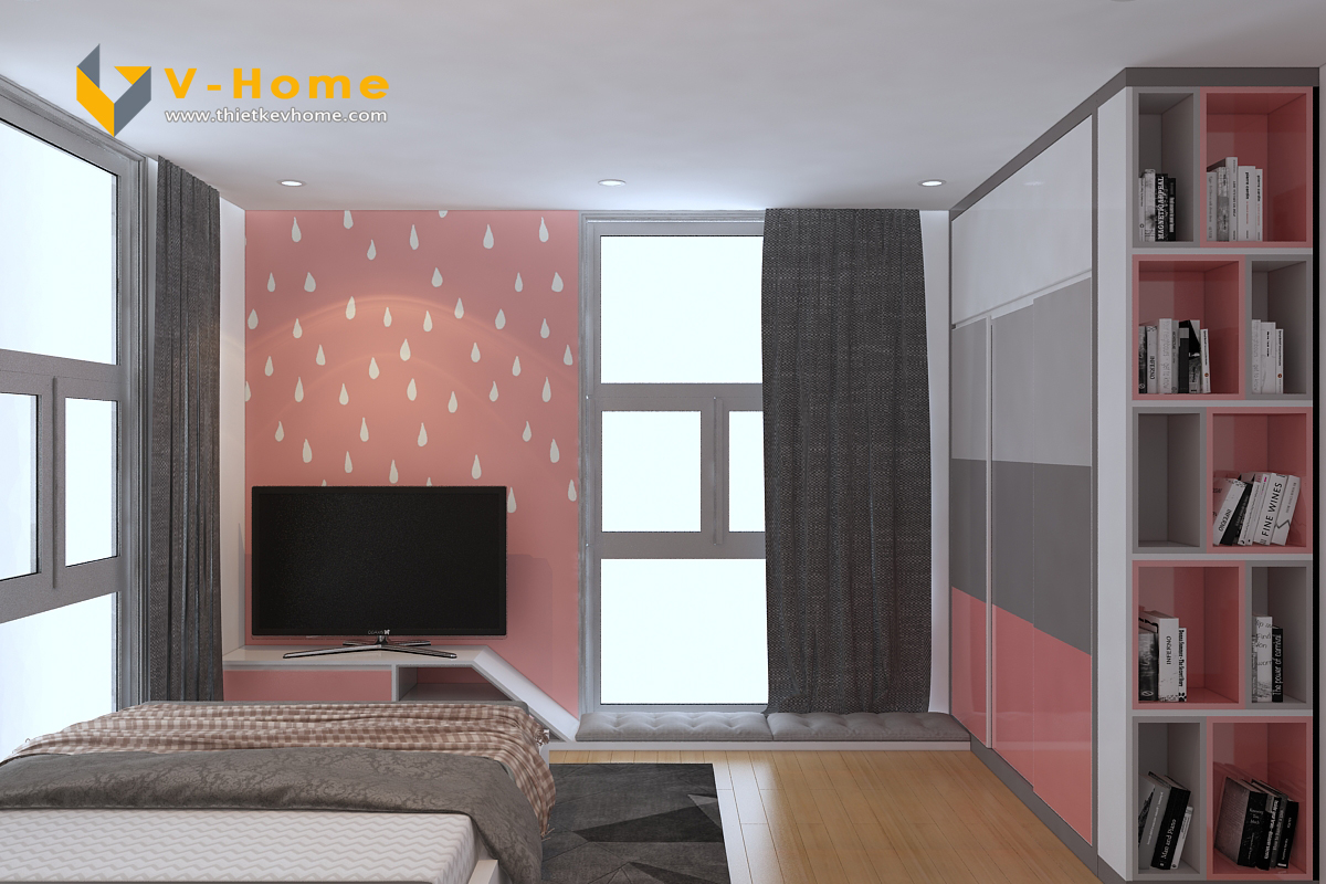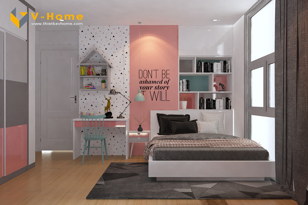 Thiết kế nội thất phòng ngủ con gái được nhấn bởi màu hồng xinh gái mang lại một không gian sống dễ thương, đậm sự nhẹ nhàng, nữ tính và kiểu cách. Màu hồng mang lại sự tươi mới, cảm giác yêu đời cho người sử dụng và ngắm nhìn nó.