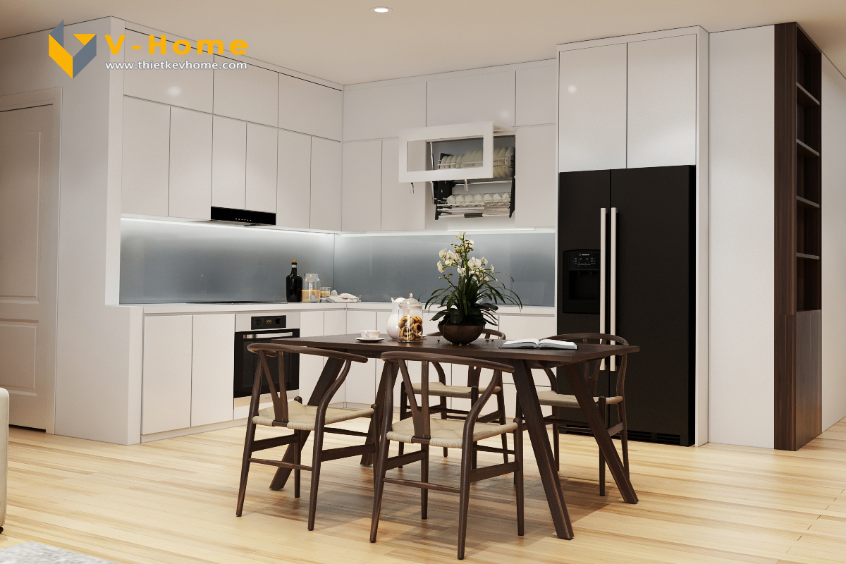 Thiết kế phòng bếp màu trắng và bàn ăn bằng gỗ tự nhiên óc chó đã trở thành điểm nhấn của không gian sinh hoạt chung của gia đình. Màu trắng mang lại vẻ sạch sẽ, bóng bẩy cho tủ bếp.