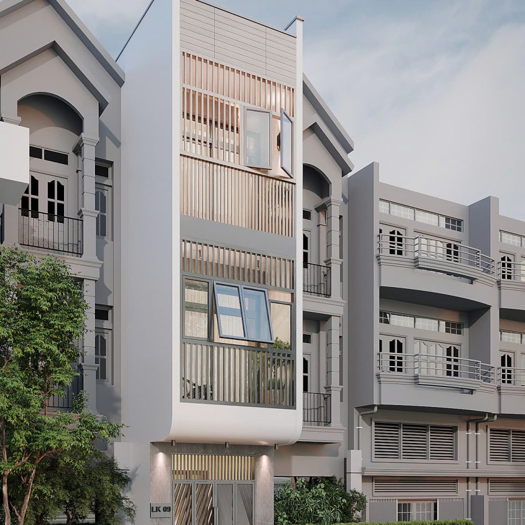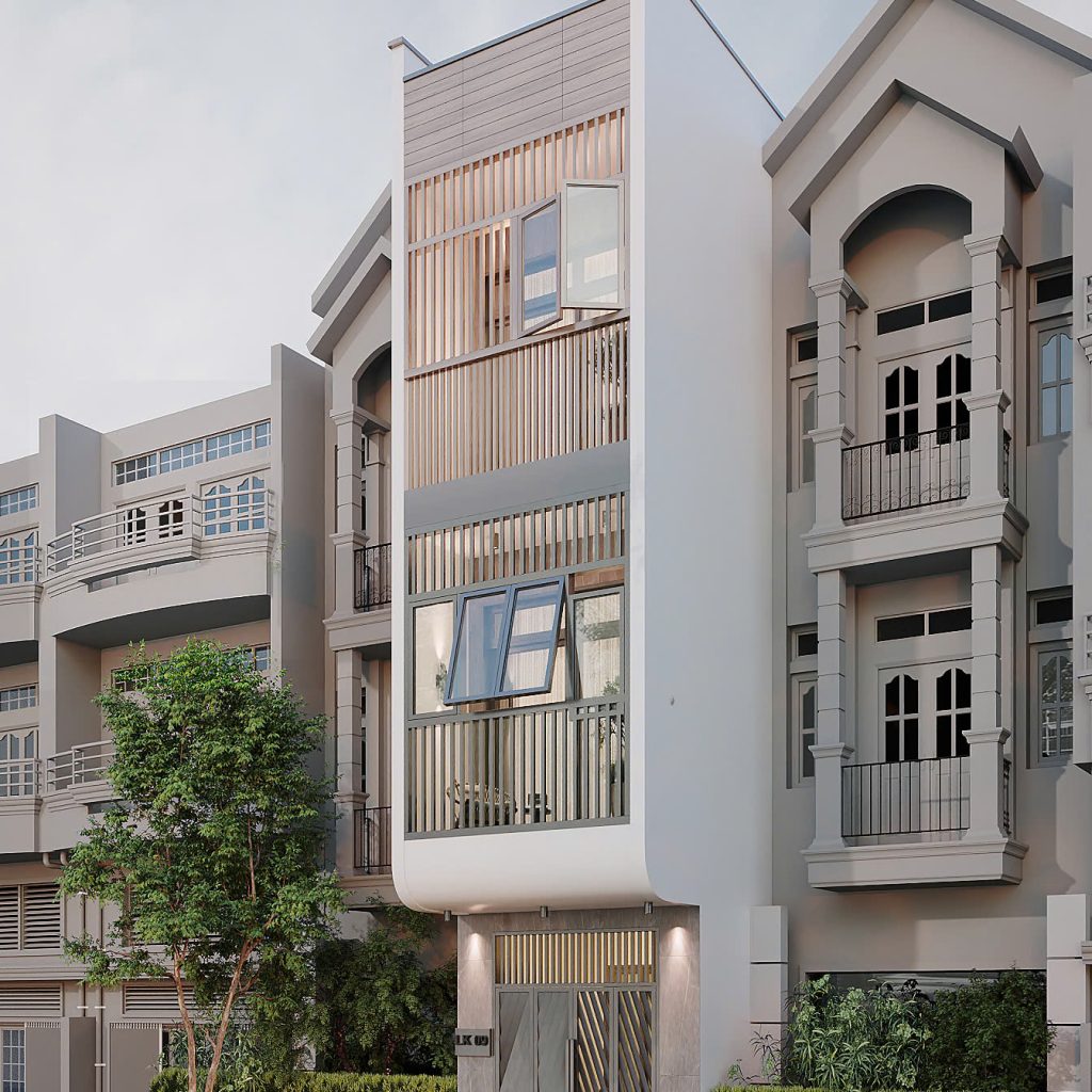 Ngôi nhà mang phong cách ngoại thất hiện đại – tối giản nhưng vẫn cuốn hút nhờ việc kết hợp hài hòa giữa: ‘Hình khối mạnh mẽ; Chất liệu sang trọng; Gam màu trung tính thịnh hành; Cách lấy sáng thông minh’. Đây là phong cách ngoại thất lý tưởng cho những gia chủ thích sự tinh tế, thanh lịch, bền vững theo thời gian và đặc biệt phù hợp với các thiết kế nhà phố diện tích hẹp.
