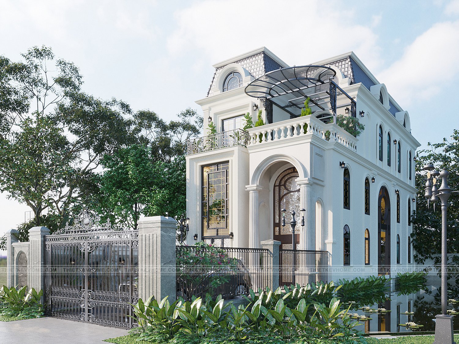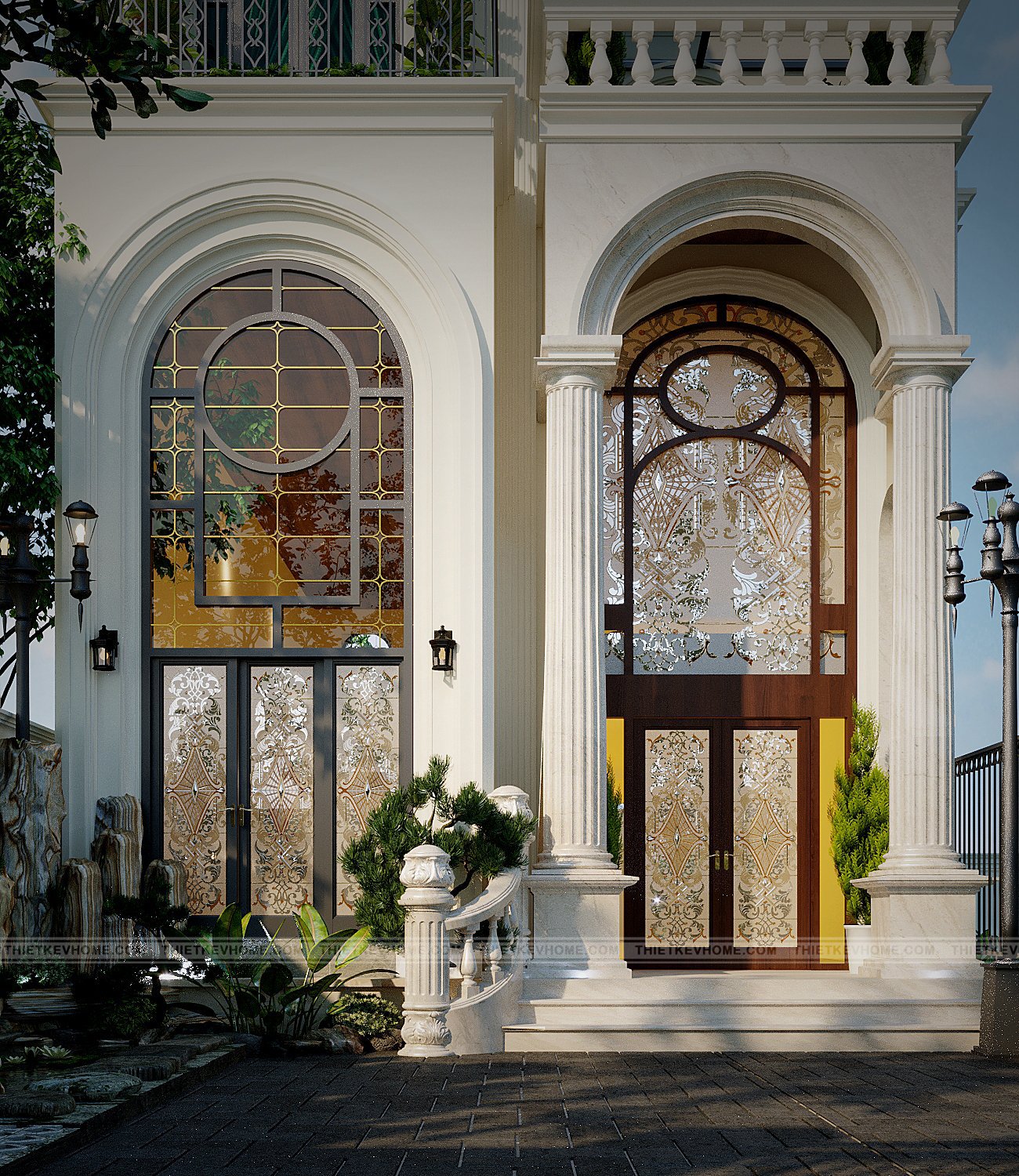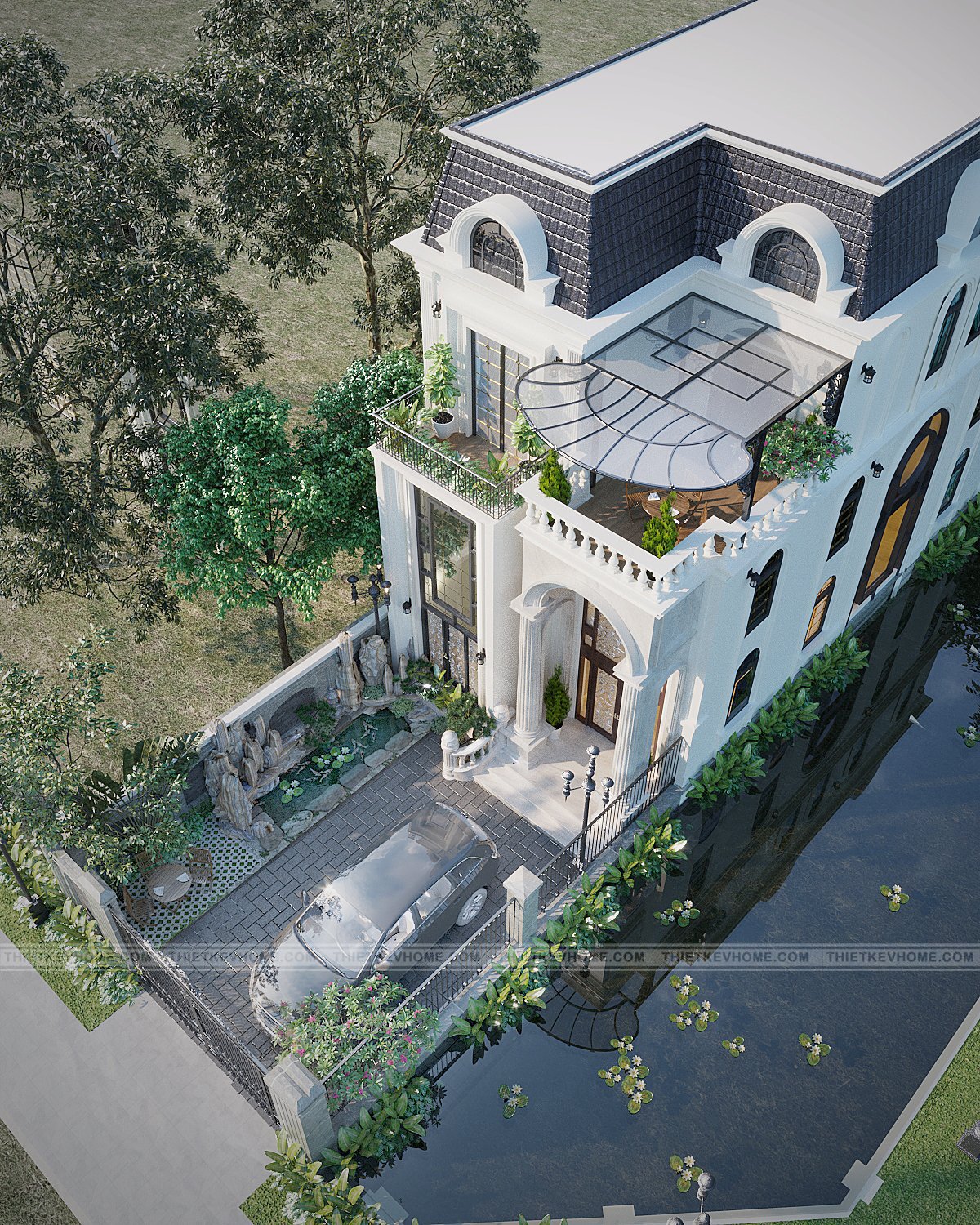 Không gian thiết kế xanh bao quanh căn nhà, kéo dài và ôm trọn căn biệt thự góp phần lớn tạo độ thoáng và phân chia không gian hợp lý hơn. Với các căn nhà trong thành phố, diện tích bao thường rất hẹp, gây ra một cảm giác khó chịu và khá tối tăm, thường sẽ là điểm xấu ảnh hưởng đến thẩm mỹ của căn nhà, tuy nhiên với thiết kế biệt thự tân cổ điển này, không gian bao quanh đủ rộng kết hợp hài hòa với không gian và tạo thêm điểm nhấn trong thiết kế cảnh quan biệt thự.
