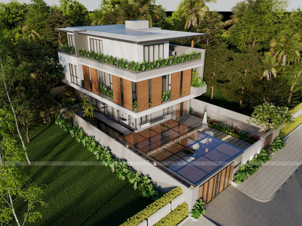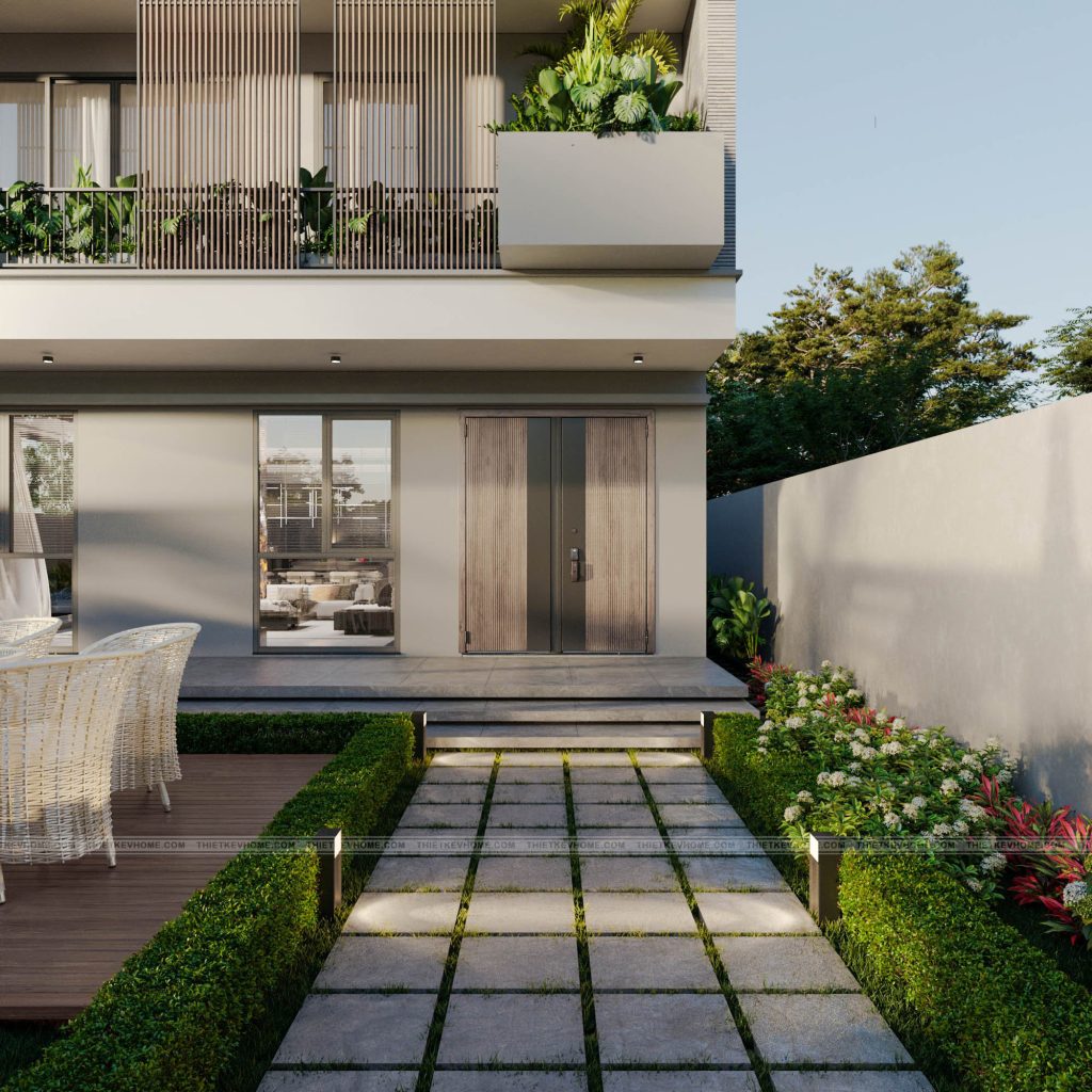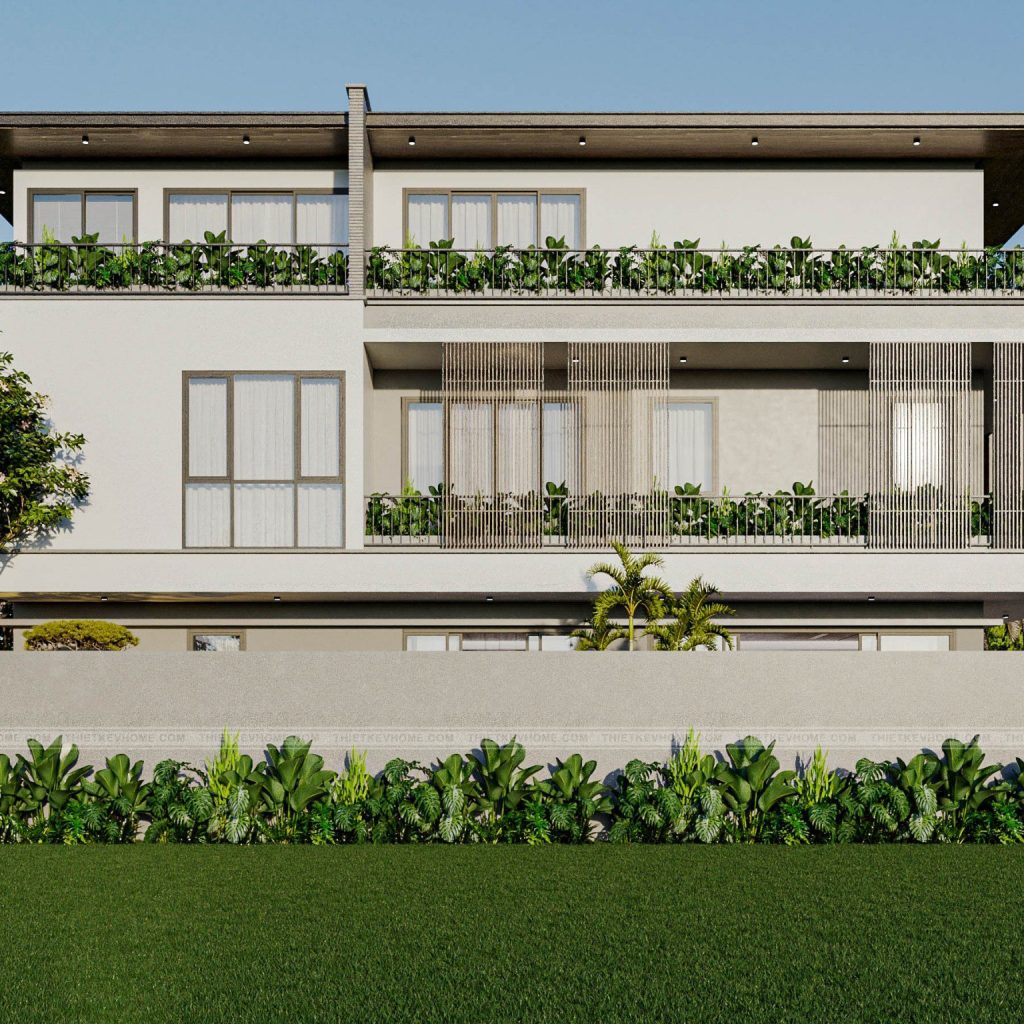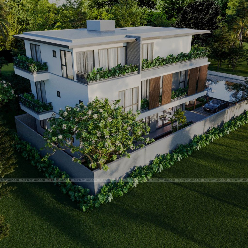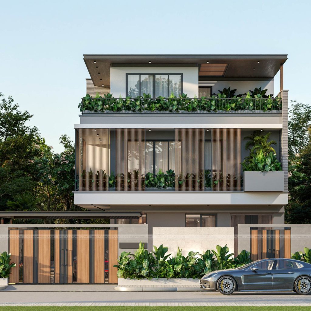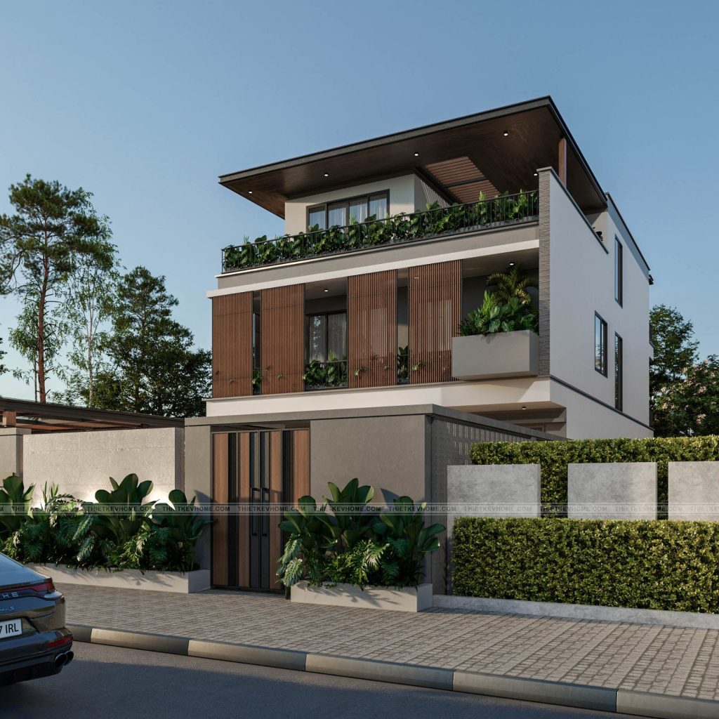 Tầng 2 & 3: phòng ngủ và không gian sinh hoạt riêng, có ban công xanh mở ra cảnh quan xung quanh. Thiết kế này tạo sự riêng tư nhưng vẫn đảm bảo tầm nhìn thoáng.