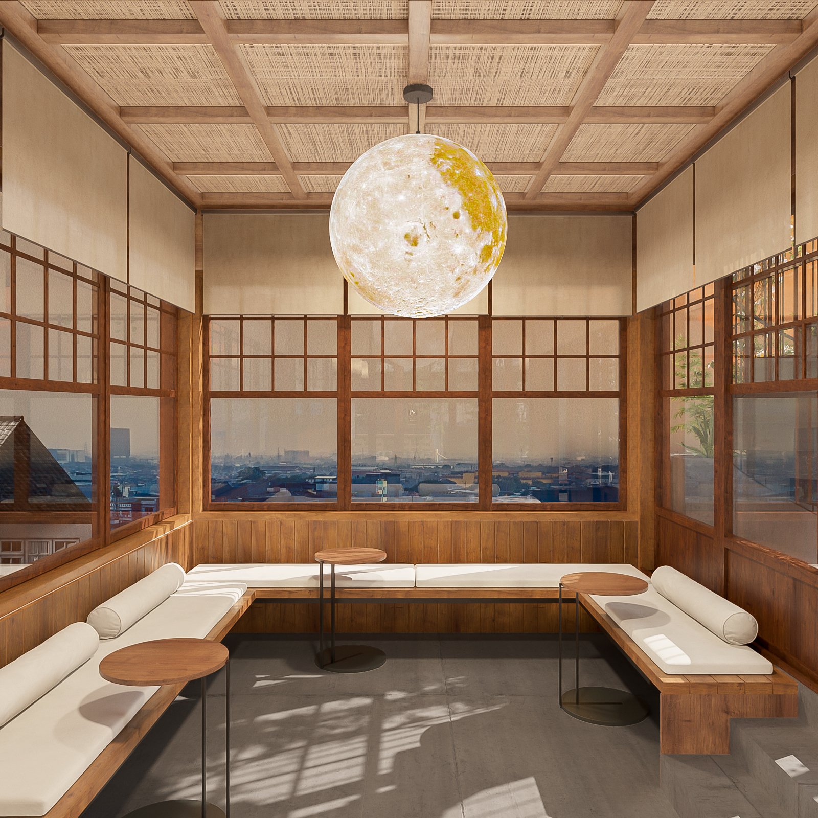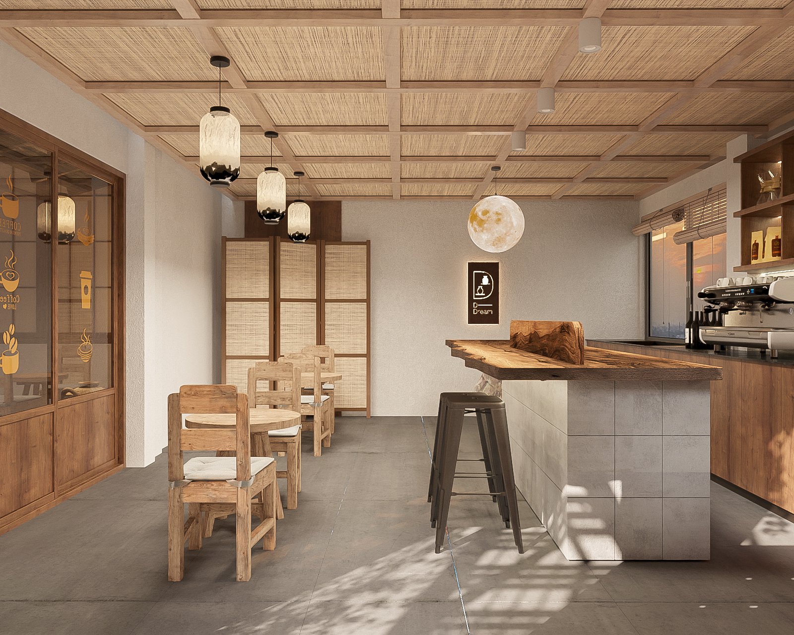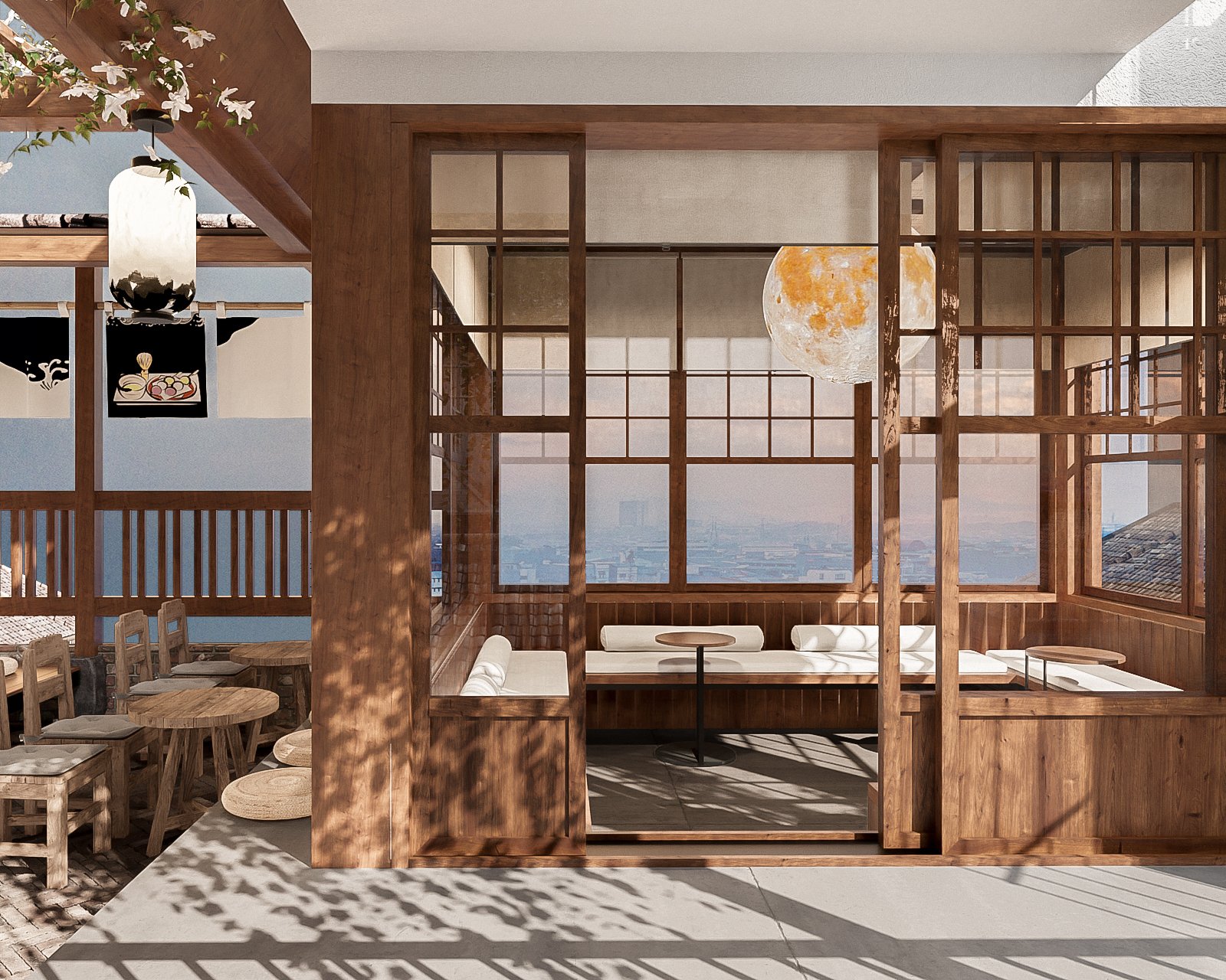 Shoji screens: Shoji screens là màn trắng xuyên sáng được làm bằng giấy hoặc vải gắn trên cửa sổ hoặc cách ngăn phòng. Chúng tạo ra ánh sáng mềm mại và tạo sự riêng tư cho các bàn ăn.