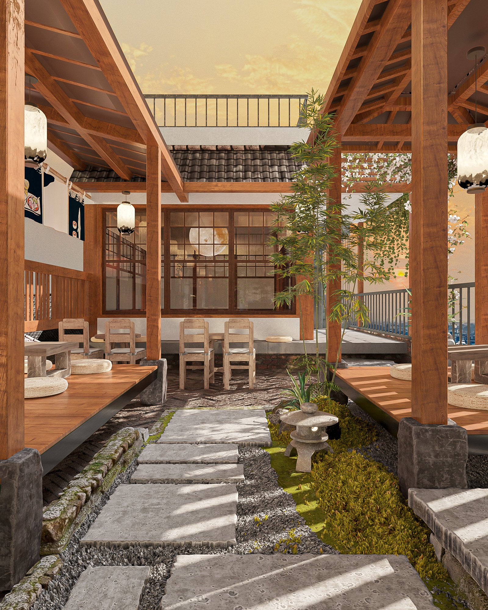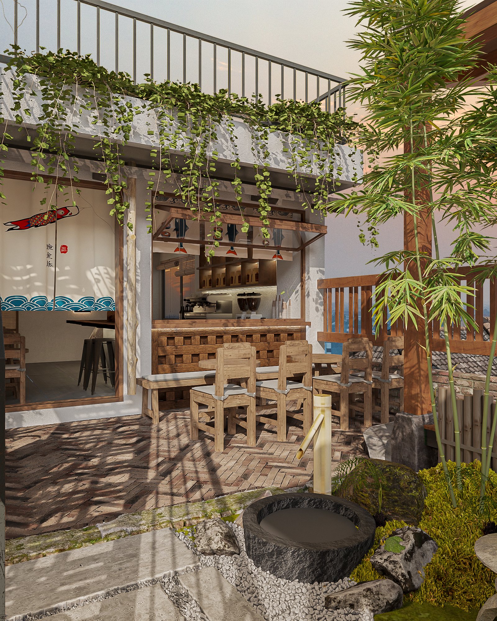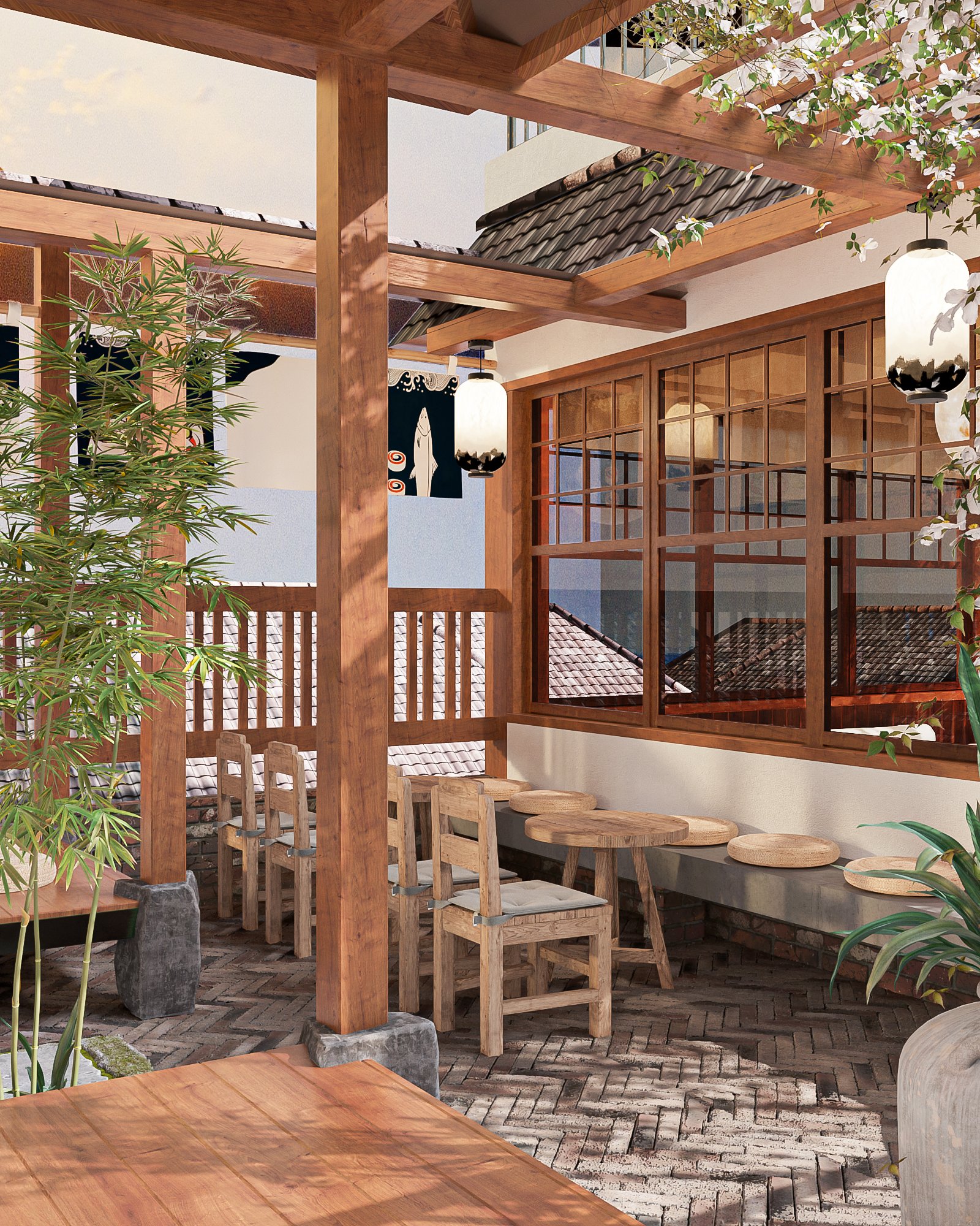 Thiết kế tường khuôn viên Nhật Bản: Một số nhà hàng Nhật Bản còn có khu vườn Nhật Bản nhỏ. Nếu điều này khả thi, hãy thêm một khuôn viên với cây cỏ, hòa mình với thiên nhiên.