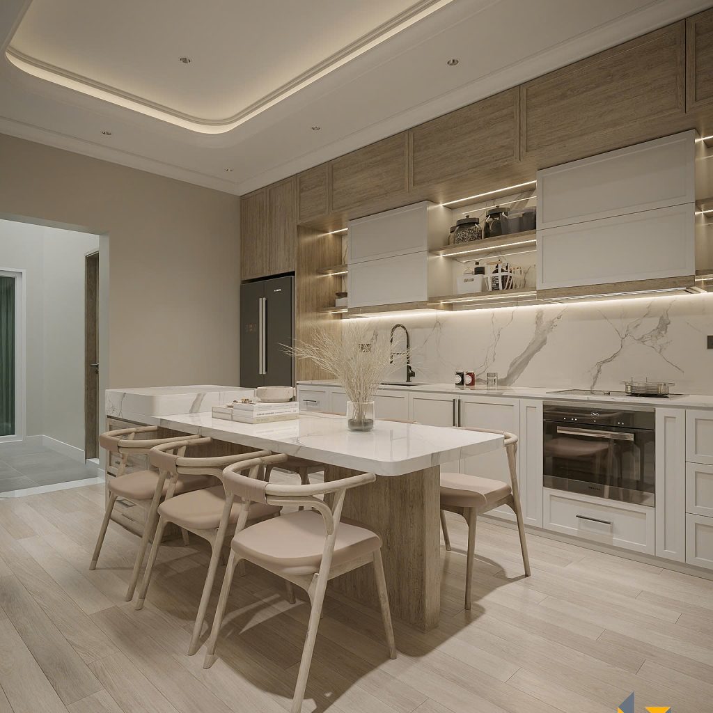 Hệ tủ âm tường gọn gàng cùng đảo bếp đá vân mây là điểm nhấn đắt giá, vừa đẹp mắt vừa tiện nghi. Tông màu gỗ sồi nhạt kết hợp cùng ánh sáng âm trần tạo nên sự ấm cúng cho từng bữa cơm gia đình.