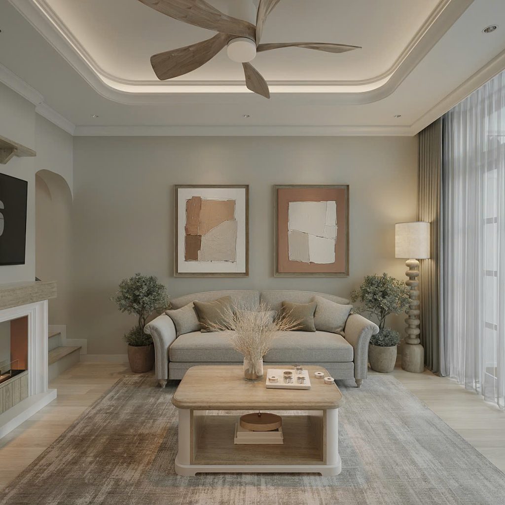 Ánh sáng tự nhiên dịu dàng len lỏi qua lớp rèm voan nhẹ, kết hợp cùng sắc trung tính chủ đạo mang đến cảm giác thư thái, dễ chịu. Những đường nét bo cong mềm mại của sofa và ghế armchair tạo nên sự gần gũi, tinh tế nhưng không kém phần sang trọng.