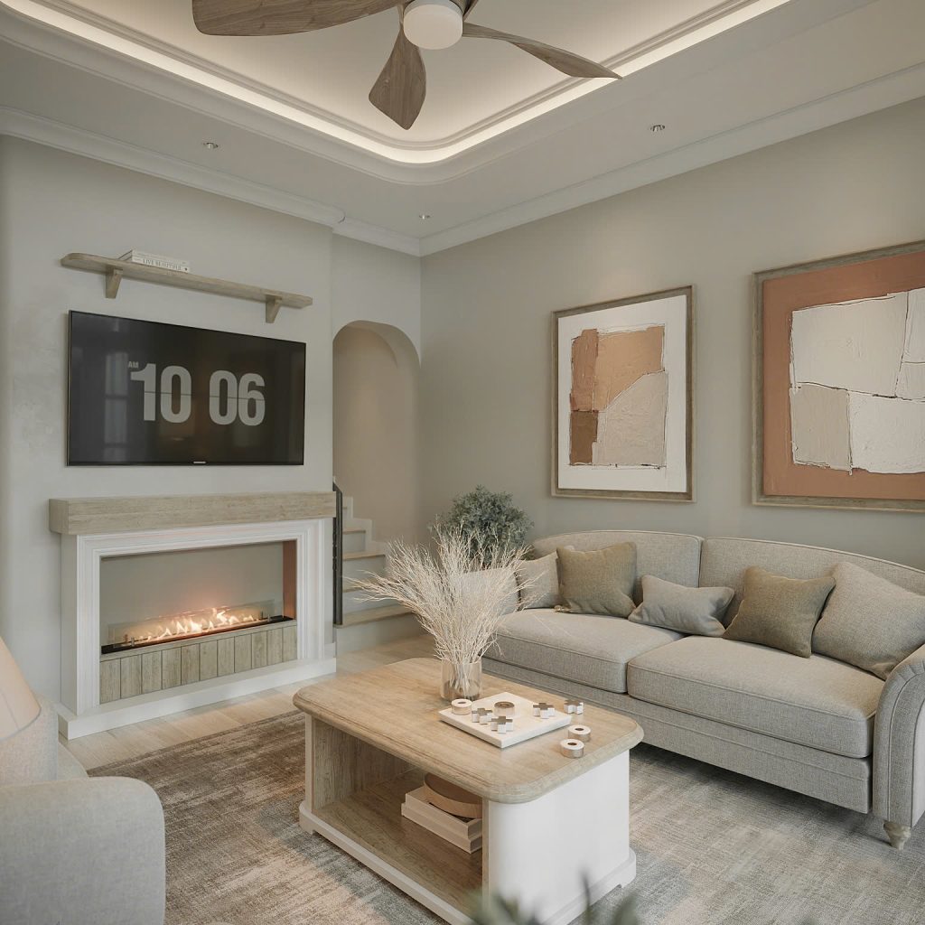 Chiếc lò sưởi hiện đại không chỉ là điểm nhấn thẩm mỹ, mà còn gợi lên cảm giác sum vầy, gần gũi – như những buổi tối mùa đông ngồi quây quần bên nhau. Quạt trần gỗ cánh lượn mềm mại không chỉ mát mẻ, mà còn là chi tiết trang trí đậm chất Zen.