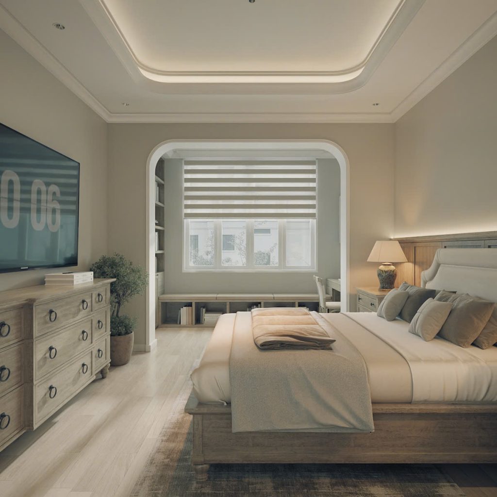 Phòng ngủ master của căn nhà mang dấu ấn bán cổ điển tinh giản, với đầu giường bo cong thanh lịch, hệ tủ và tab gỗ sáng mộc mạc, cùng ánh sáng gián tiếp dịu nhẹ tạo nên một tổng thể trang nhã, ấm cúng nhưng vẫn rất hiện đại và thoải mái.