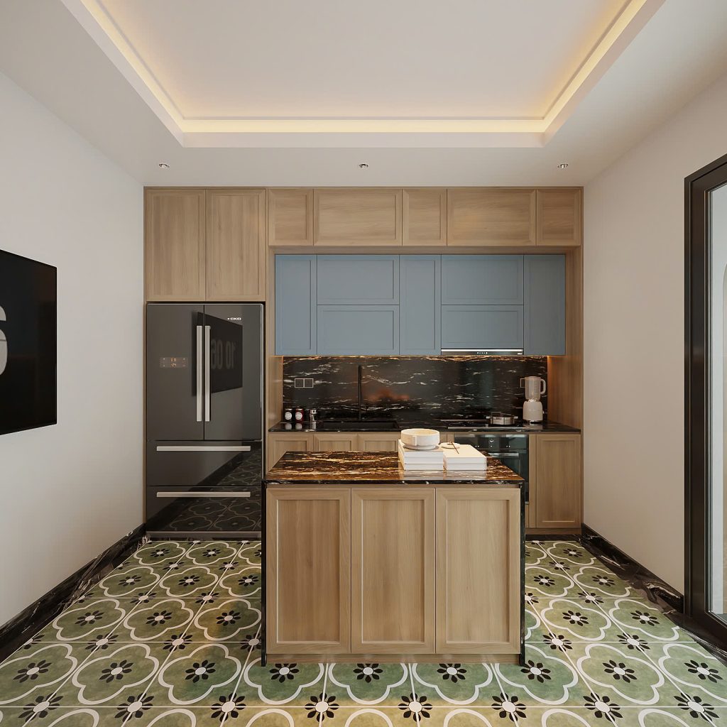 Bước vào gian bếp này, ta có cảm giác như vừa ghé chân vào một không gian thân thuộc — nơi truyền thống và hiện đại hòa quyện trong từng chi tiết. Điểm nhấn đầu tiên chính là nền gạch bông họa tiết hoa văn cổ điển, sắc xanh dịu mắt, vừa gợi nhớ không gian bếp xưa của những ngôi nhà Việt, vừa tạo nên nét duyên riêng cho tổng thể.