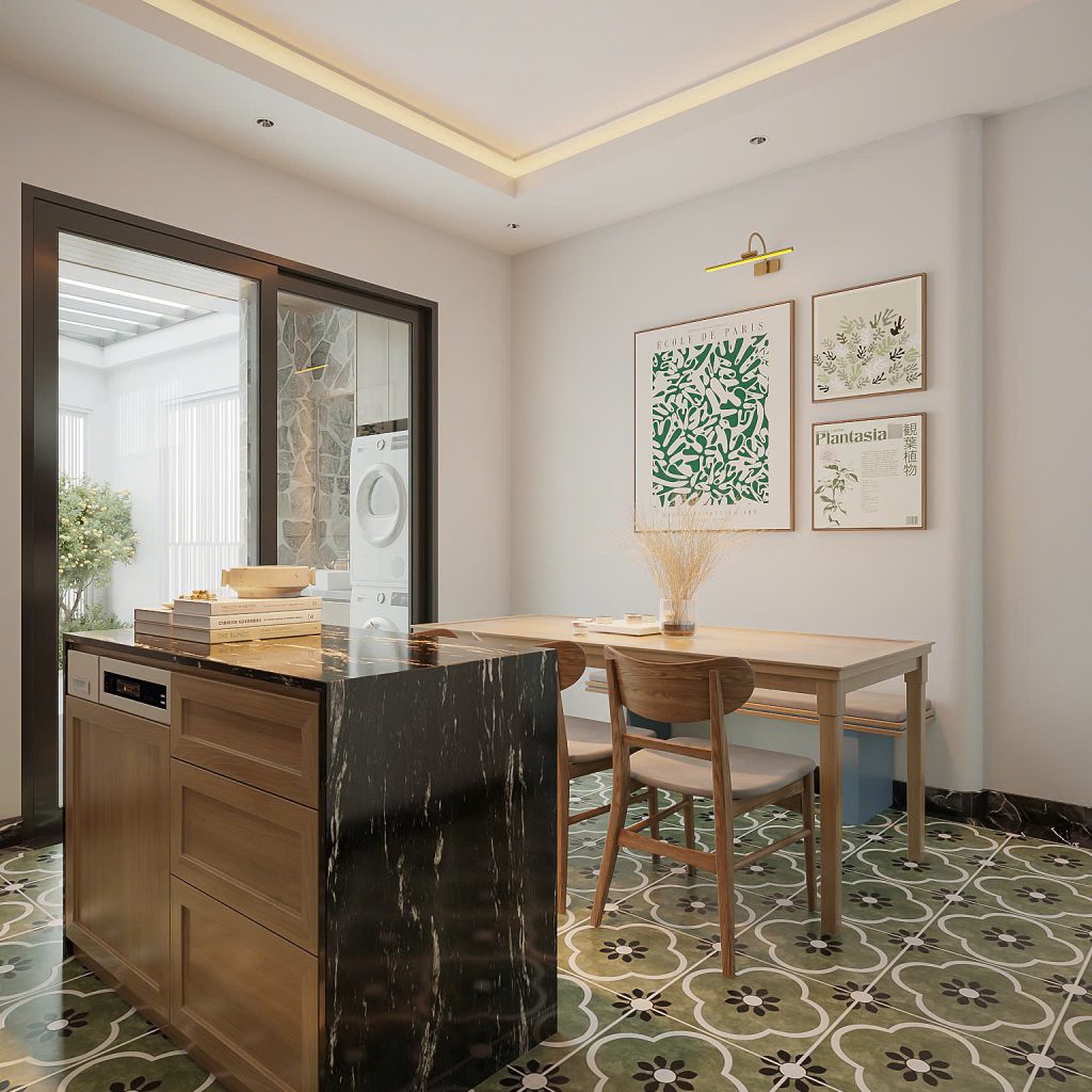 Điểm nhấn đầu tiên là nền gạch bông hoạ tiết cổ điển, sắc xanh rêu dịu mắt tạo nên một không gian đầy hoài niệm nhưng vẫn rất thời thượng. Những đường viền marble đen vân mây tạo chiều sâu sang trọng, làm nổi bật tổng thể thiết kế.
