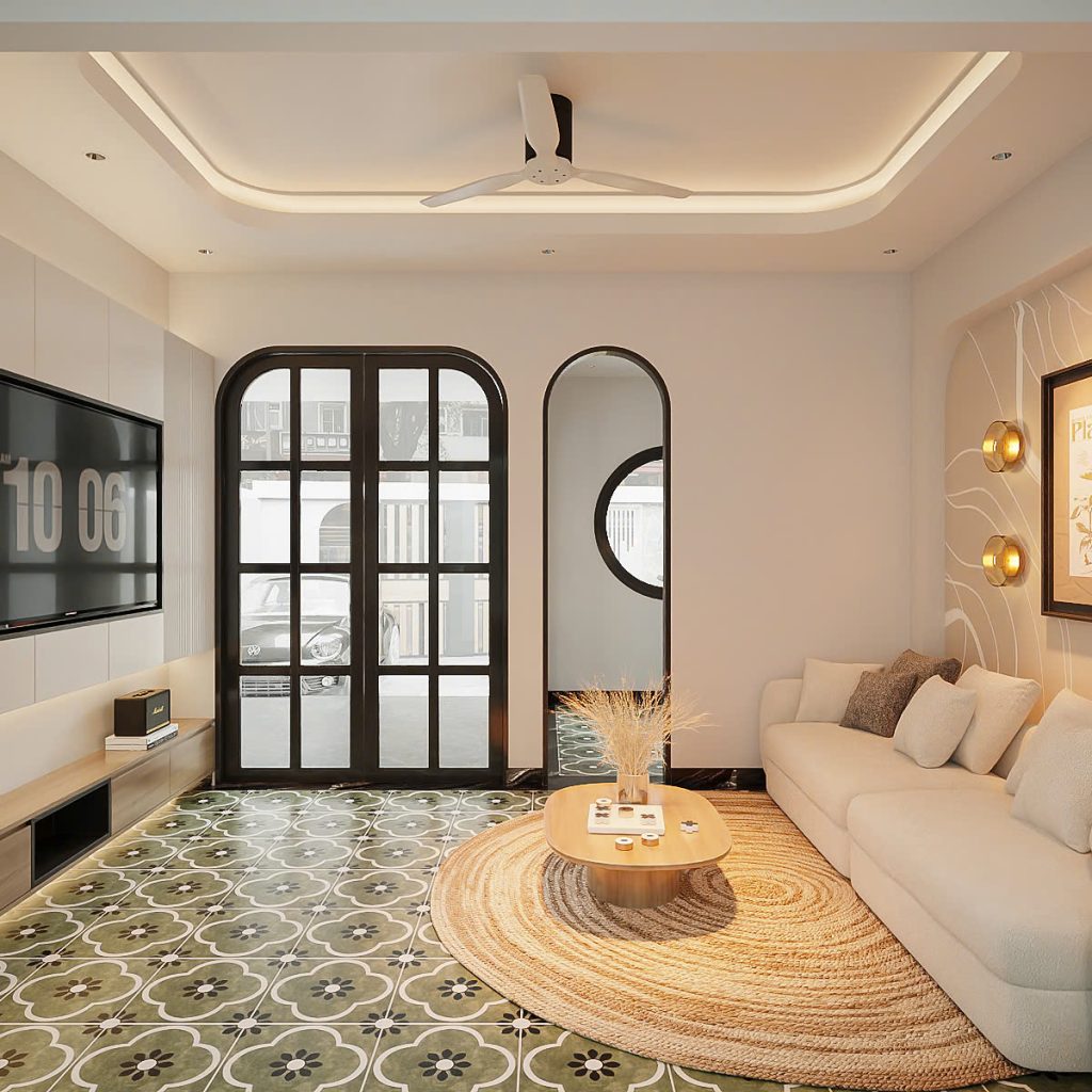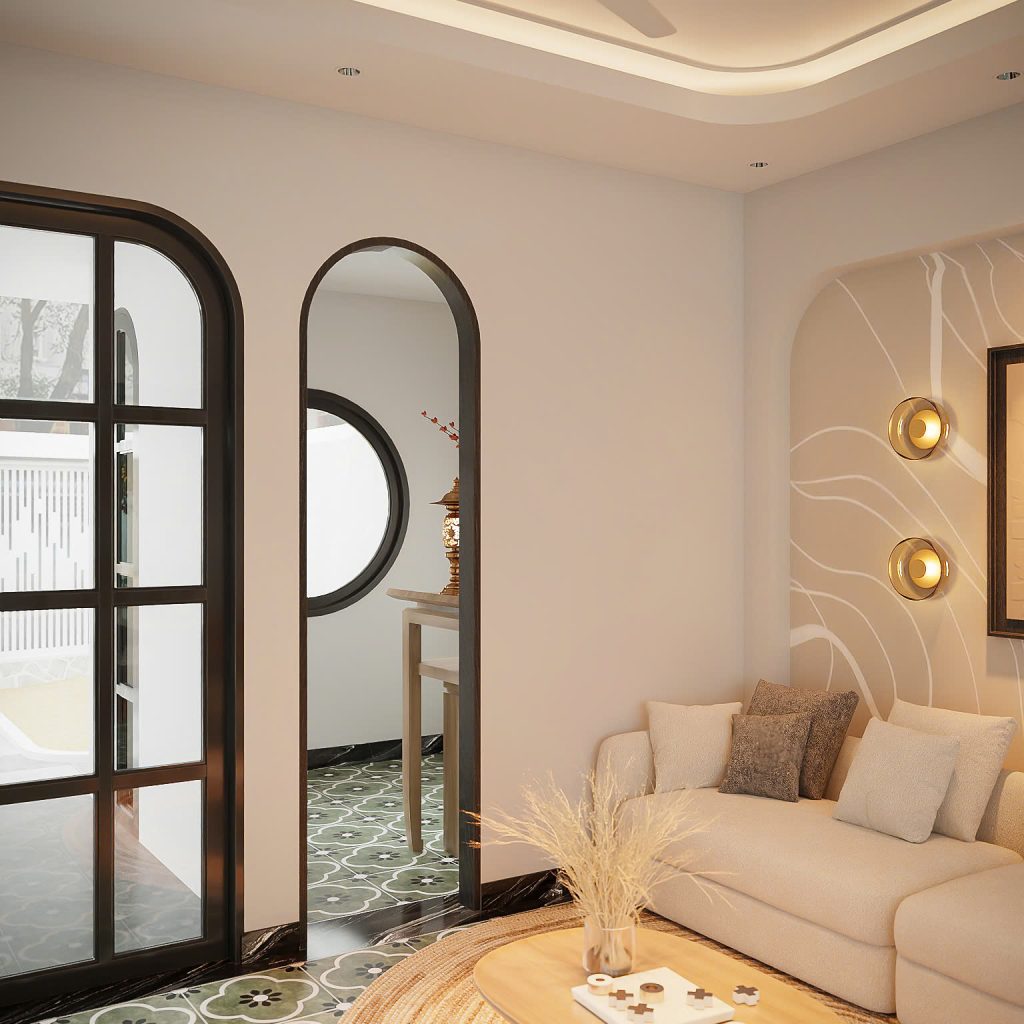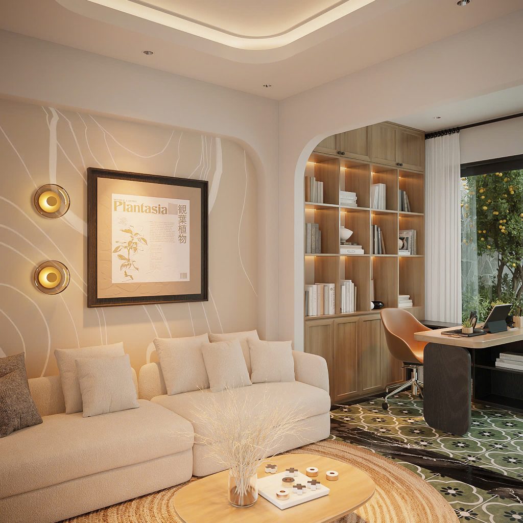 Không gian phòng khách và phòng làm việc được liên kết khéo léo qua các vòm cửa mềm mại – chi tiết kiến trúc gợi nhớ phong cách Đông Dương nhưng được thể hiện tinh tế trong bối cảnh hiện đại. Bộ sofa vải thô gam kem, chiếc bàn trà tròn đơn giản cùng thảm cói thủ công mang đến cảm giác ấm cúng, gần gũi.