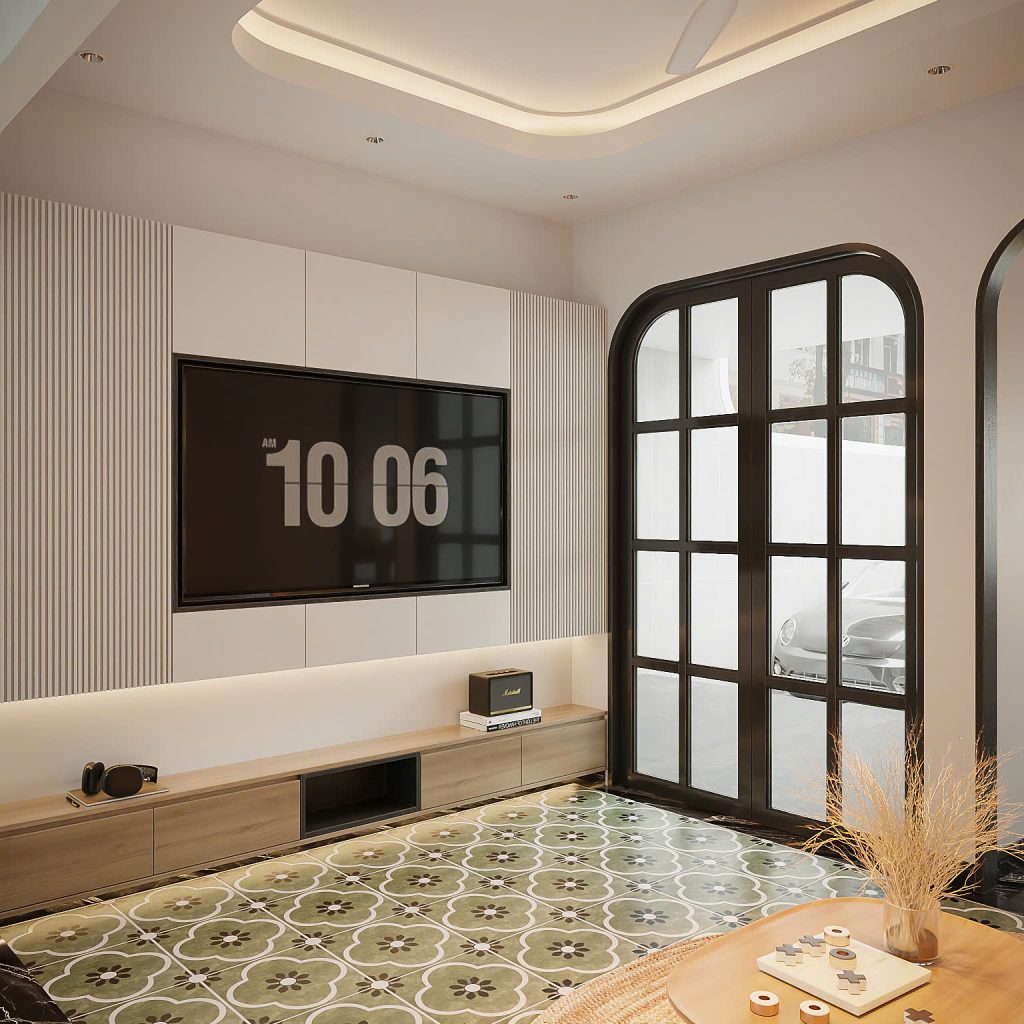 Trần nhà với các đường bo uốn cong và đèn hắt trần dịu nhẹ, kết hợp cùng quạt trần thanh thoát, mang lại sự thoáng đãng và thư giãn hoàn hảo. Căn nhà không chỉ là chốn về, mà còn là một tuyên ngôn về phong cách sống: thanh lịch, tinh tế và trọn vẹn cảm xúc.