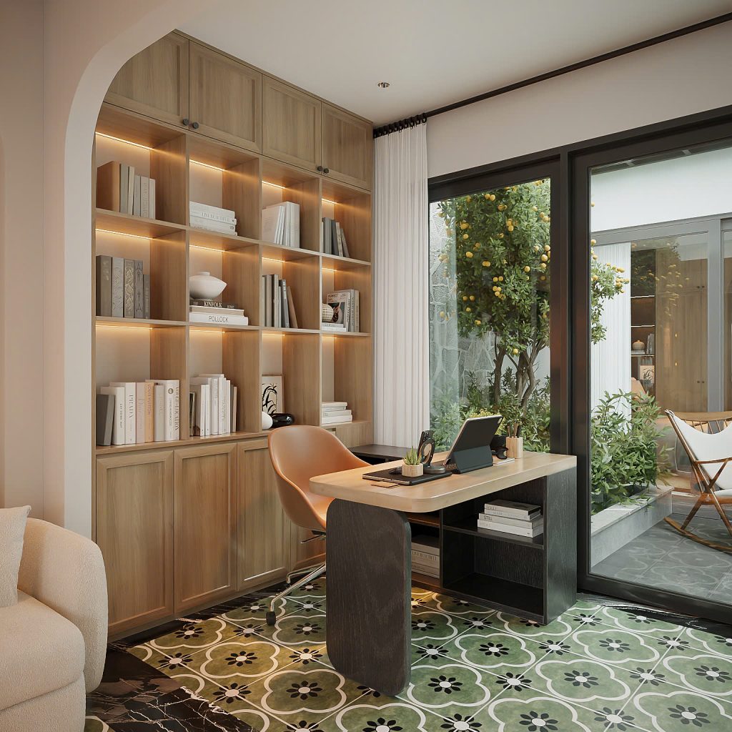 Khu vực làm việc là một “ốc đảo sáng tạo” với kệ sách âm tường gỗ sồi, ánh sáng hắt nhẹ tạo chiều sâu thị giác và bầu không khí yên bình. Cửa kính lớn mở ra khoảng sân trong xanh mát, kết nối thiên nhiên vào từng góc nhỏ của căn nhà – điều mà nhiều người tìm kiếm trong nhịp sống đô thị hiện đại.