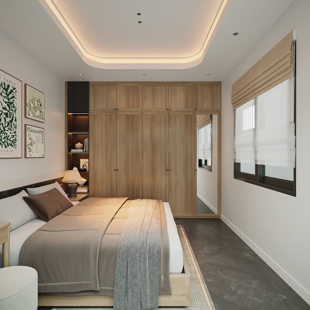 Nổi bật với tông màu gỗ ấm áp, chiếc giường ngủ kiểu dáng đơn giản nhưng đầy tinh tế hòa quyện với hệ tủ âm tường chạm trần, mang đến không gian lưu trữ tối ưu mà vẫn giữ được nét thanh lịch. Điểm nhấn ánh sáng hắt trần nhẹ nhàng, cùng những chi tiết décor tường tinh tế tạo nên một tổng thể trang nhã, tràn ngập cảm hứng nghỉ ngơi.