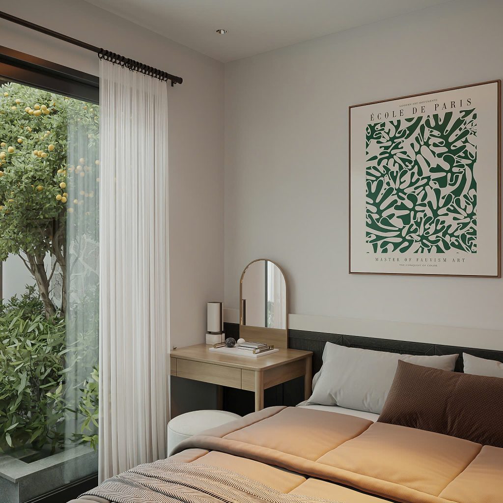 Mọi chi tiết, từ bàn làm việc kiêm bàn trang điểm nhỏ gọn, đến đèn ngủ kiểu cổ điển, đều được bố trí khéo léo để tôn vinh vẻ đẹp mộc mạc nhưng hiện đại. Cửa kính lớn mở ra khu vườn xanh mát — nơi ánh sáng tự nhiên và hơi thở của thiên nhiên len lỏi vào từng góc nhỏ, đem lại cảm giác thoáng đãng và dễ chịu mỗi sớm mai.