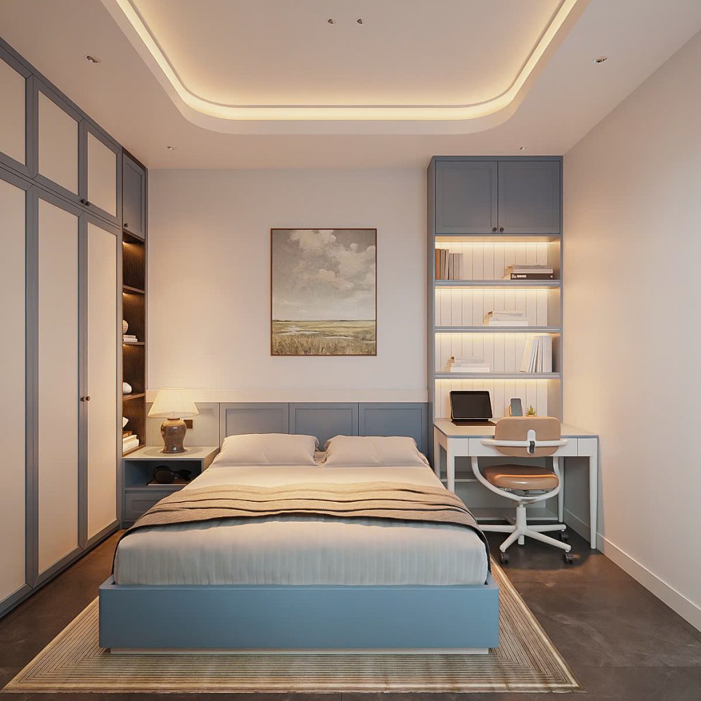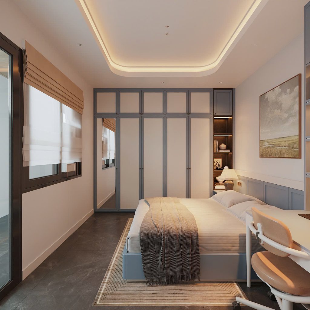 Hệ tủ âm tường cao kịch trần được thiết kế thông minh, tối đa hóa không gian lưu trữ mà vẫn giữ được vẻ gọn gàng, tinh tế. Chiếc giường trung tâm với đường nét vuông vức, kết hợp đầu giường đồng bộ màu sắc, mang lại sự cân bằng và nhẹ nhàng. Góc học tập và làm việc được bố trí khéo léo bên khung cửa sổ thoáng sáng, giúp khai thác tối đa nguồn sáng tự nhiên, tạo cảm hứng sáng tạo trong từng khoảnh khắc.