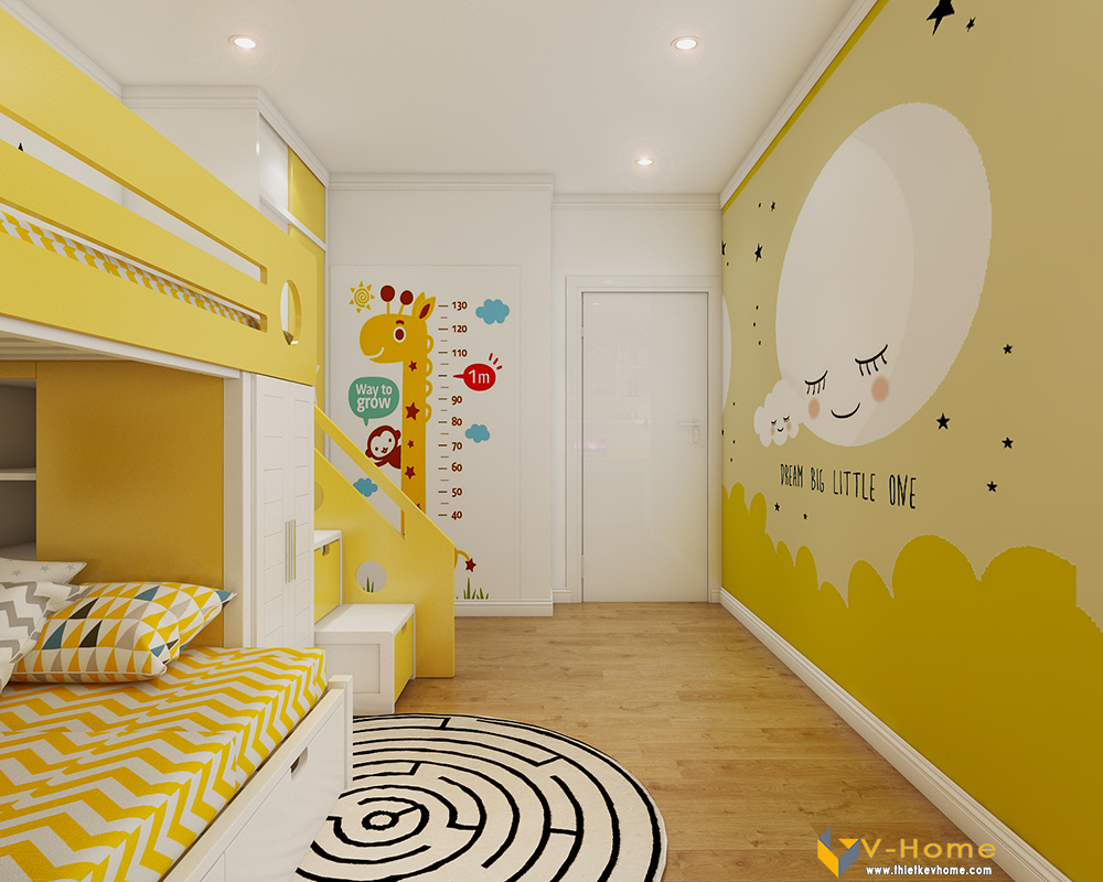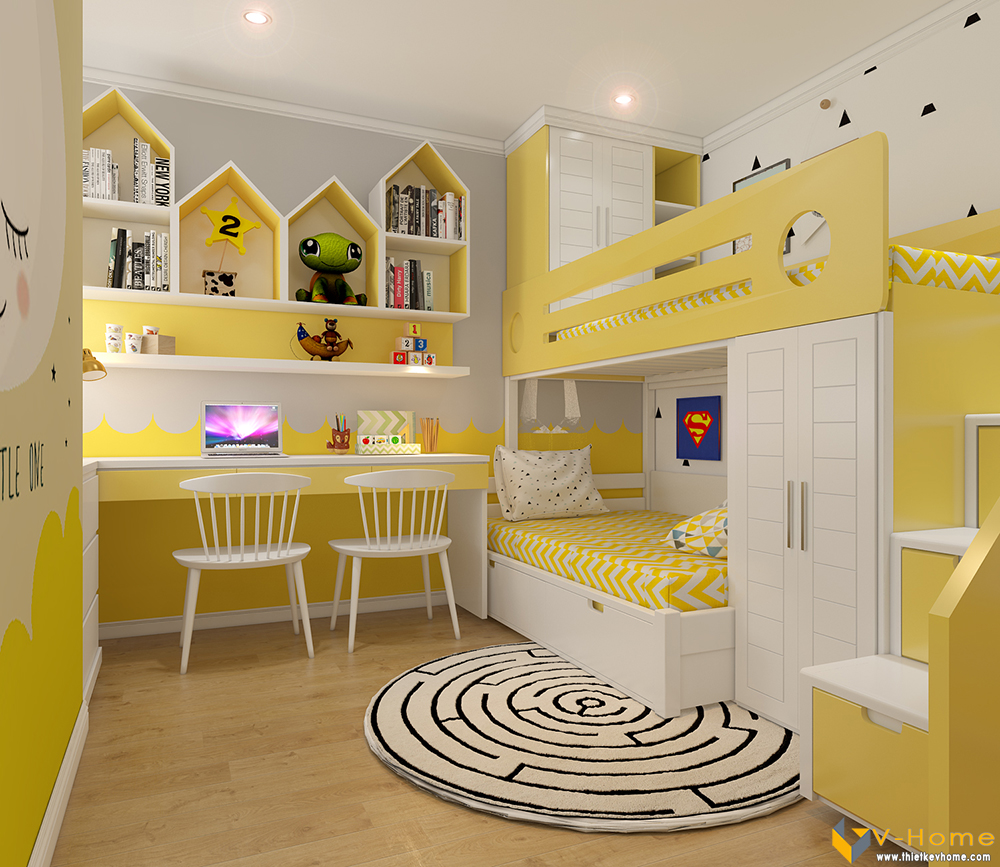 Tuy nhiên, thiết kế phòng ngủ trẻ lại hoàn toàn phá cách với phương hướng hiện đại. Căn hộ chung cư chỉ có hai phòng ngủ nên kiến trúc sư đã lựa giường tầng để tối ưu hóa diện tích mà vẫn đảm bảo công năng sử dụng. Với tone màu vàng tươi sáng đã mang lại cho toàn bộ căn phòng sự tươi mới và cảm hứng học tập, vui chơi cho con trẻ.