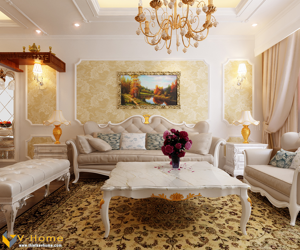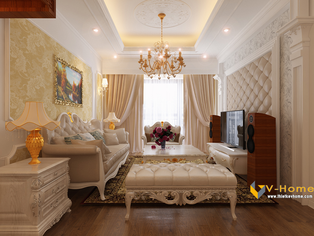 Thiết kế nội thất phòng khách sử dụng tone màu trắng, kết hợp nâu sáng, điểm nhũ vàng mang đến sự nổi trội cho căn phòng. Hiểu được sự hạn chế của căn hộ chung cư, các kiến trúc sư đã khéo léo sử dụng bộ sofa, bàn trà, kệ tủ với những chi tiết uốn lượn của chân bàn, chân ghế, tay vịn, lựng tựa tạo nên sự mềm mại, sang chảnh của khu vực tiếp khách. Mặt khác, phòng khách được đặt vị trí gần cửa sổ mang lại ánh sáng tự nhiên và tạo sự cân bằng trong thiêtkế màu sắc, không gian.