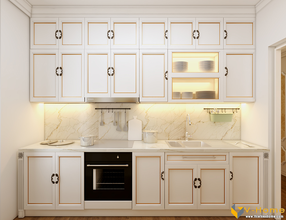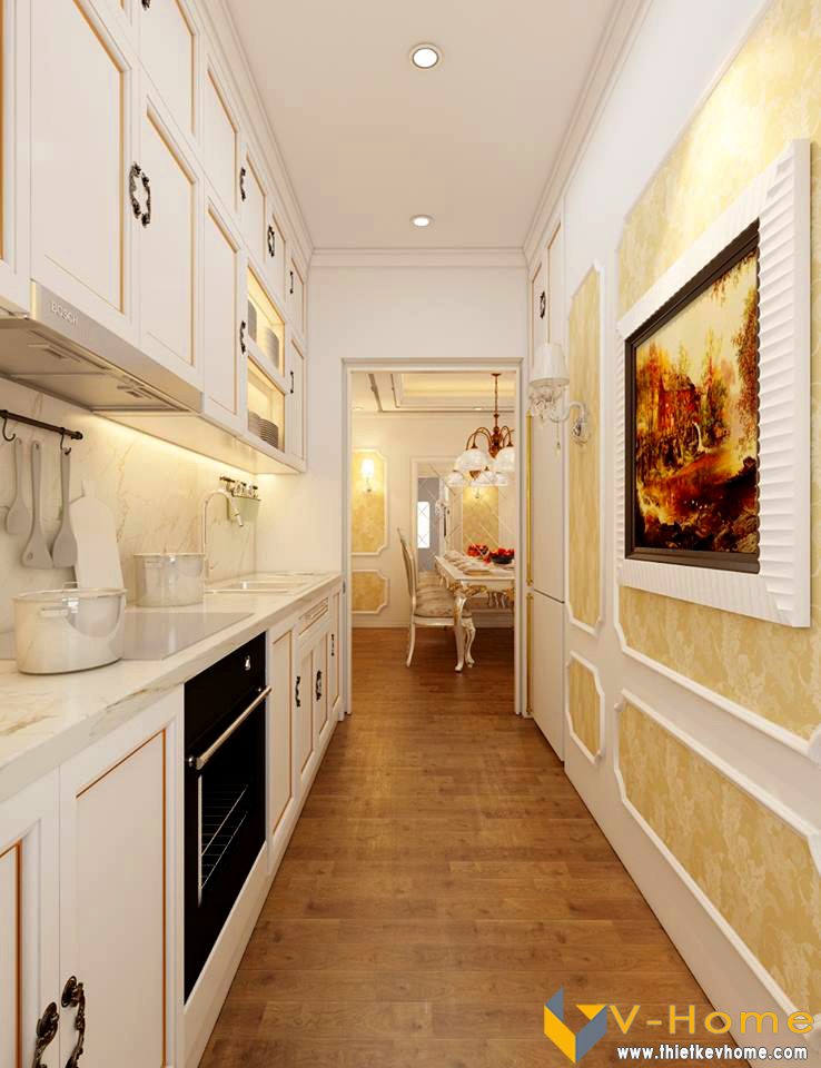 Thiết kế phòng ăn và bếp liền kề không bị phân chia tạo thành một khối liền mạch mang sự tiện nghi và thoải mái cho gia chủ. Các đường phào chỉ tạo điểm nhấn nhẹ nhàng cho căn bếp.