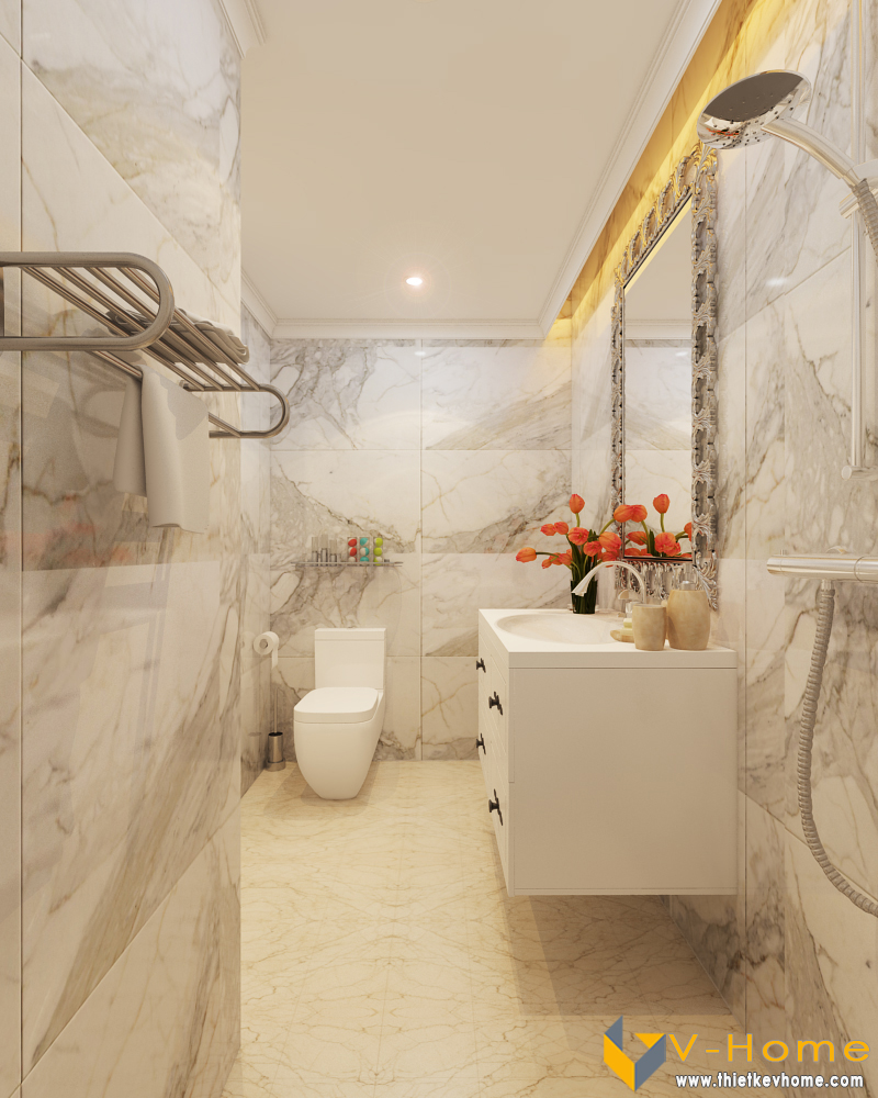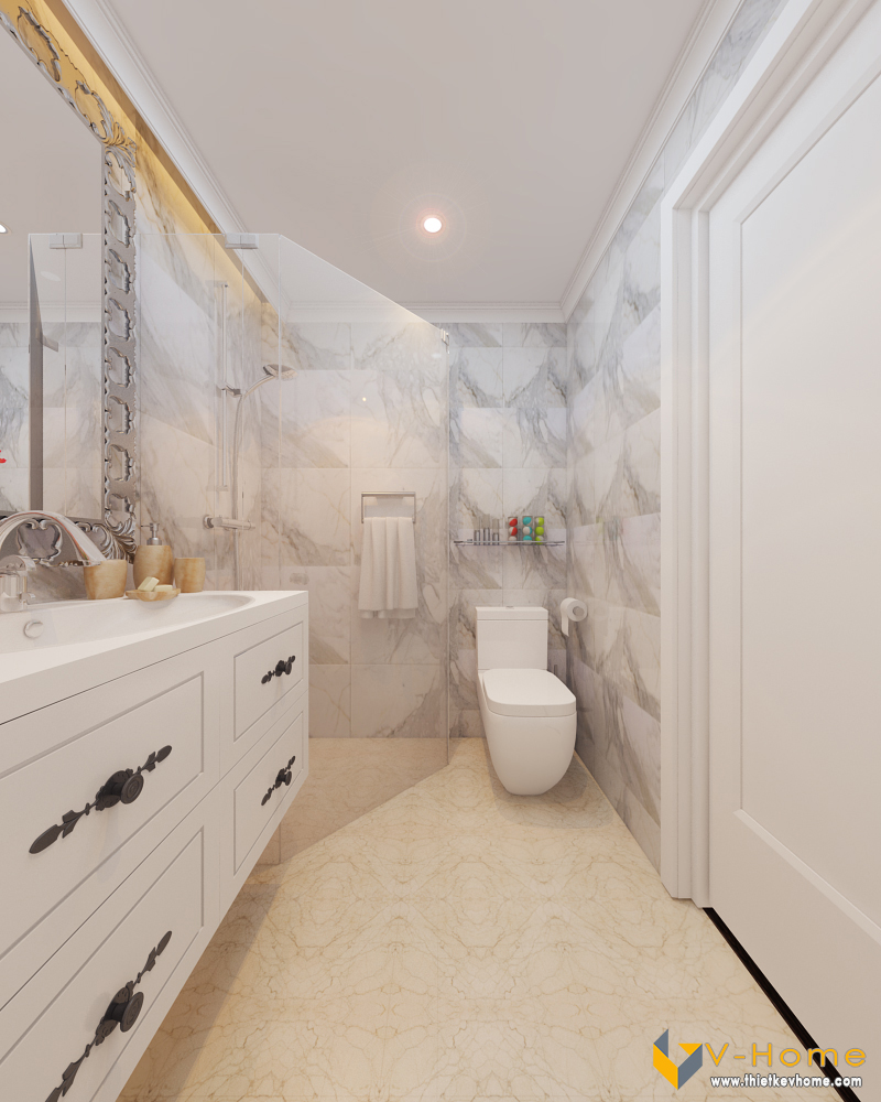 Cuối cùng là không gian phòng vệ sinh phong cách tân cổ điển. Vách kính tắm đứng được kiến trúc sư ưu ái sử dụng mang đến cảm giác cơi nới cho không gian. Một không gian thư giãn, khá đơn giản nhưng nhờ đường nét và màu sắc tinh tế mà vẫn nổi lên sự sang trọng và quý phái đậm phong cách Tân cổ điển.
