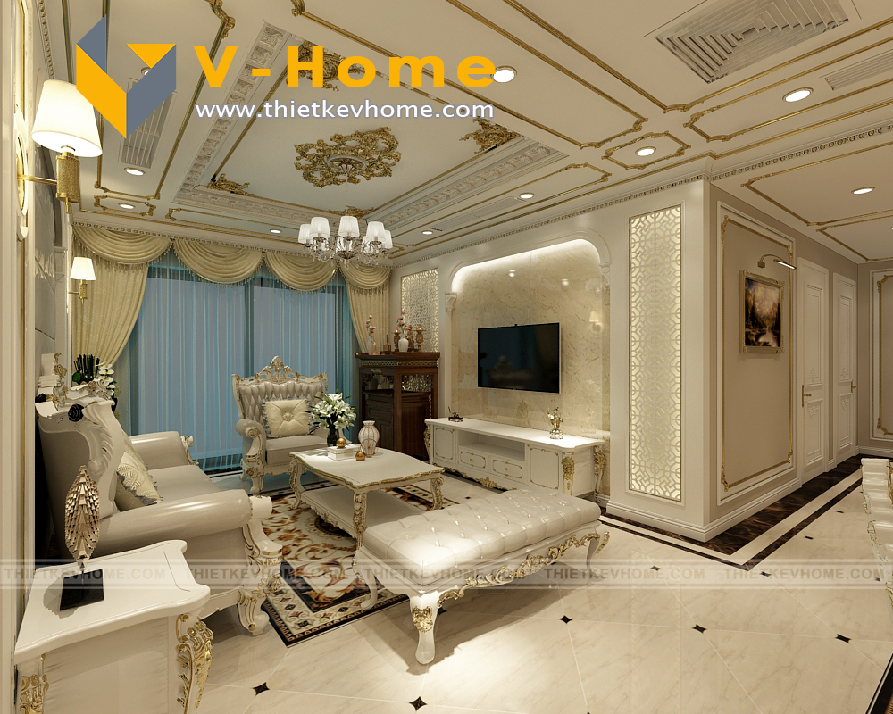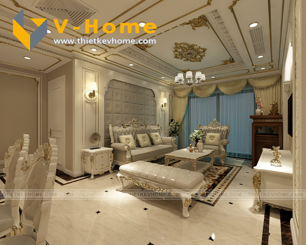 Với những đường nét thiết kế tinh xảo, tỉ mỉ đến từng chi tiết, thêm chút nhấn nhá của sắc vàng kim, không gian nội thất thực sự trở thành một nơi đáng sống, đáng mơ ước. Thiết kế phòng khách tân cổ điển với bộ sofa nguy nga, đồ sộ và tráng lệ chiếm lĩnh trung tâm. Vẻ đẹp của nội thất tỏa ra khắp không gian từ sàn nhà, tường và trần nhà, tất cả đều mang đến vẻ đẹp diễm lệ cho căn hộ chung cư 2 phòng ngủ này.