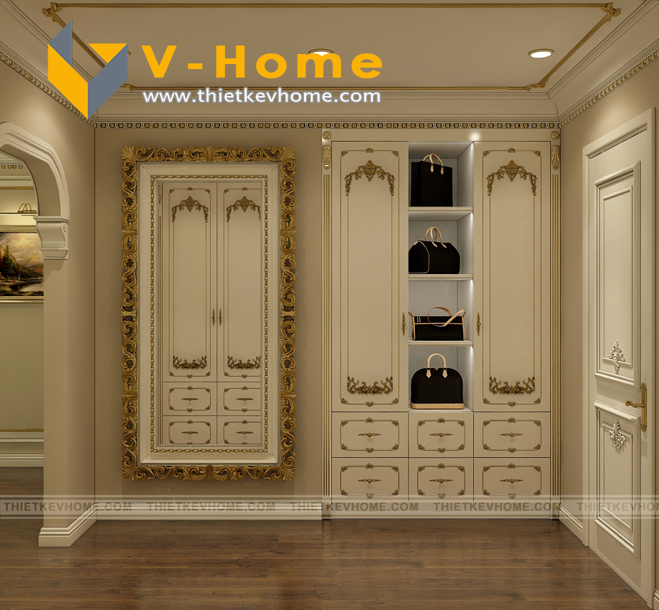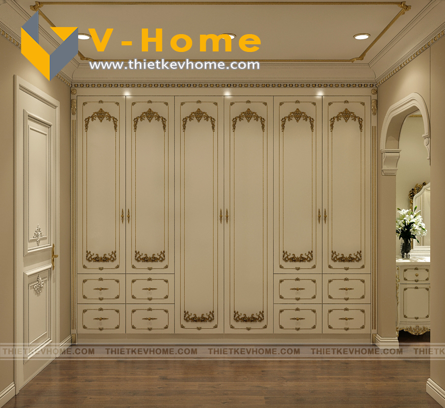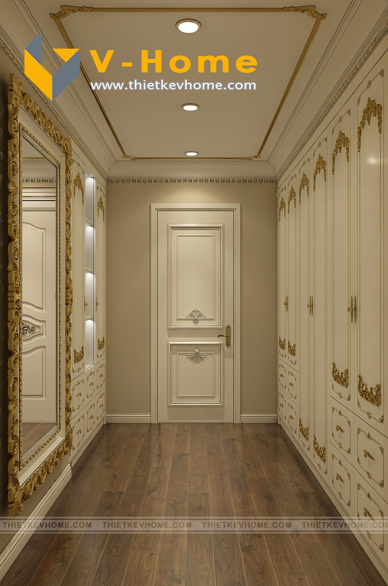 Phòng ngủ master được thiết kế riêng một phòng thay đồ rộng rãi và sang trọng. Thiết kế tủ quần áo tân cổ điển cao sát trần, tận dụng tối đa không gian và tối đa công năng sử dụng.
