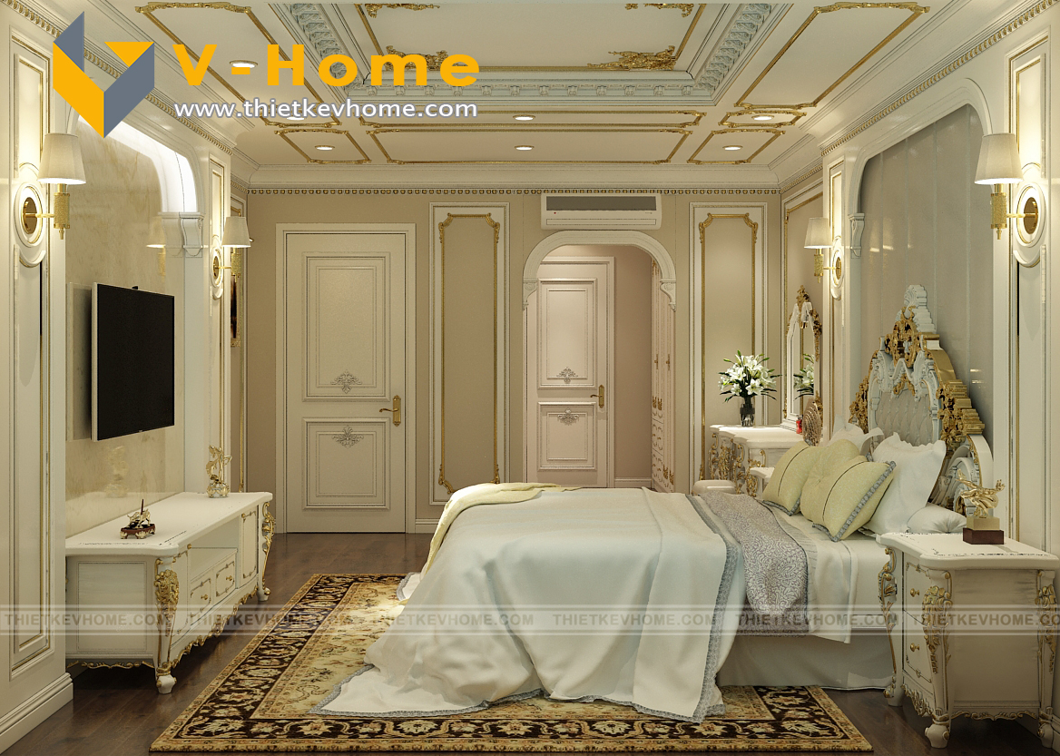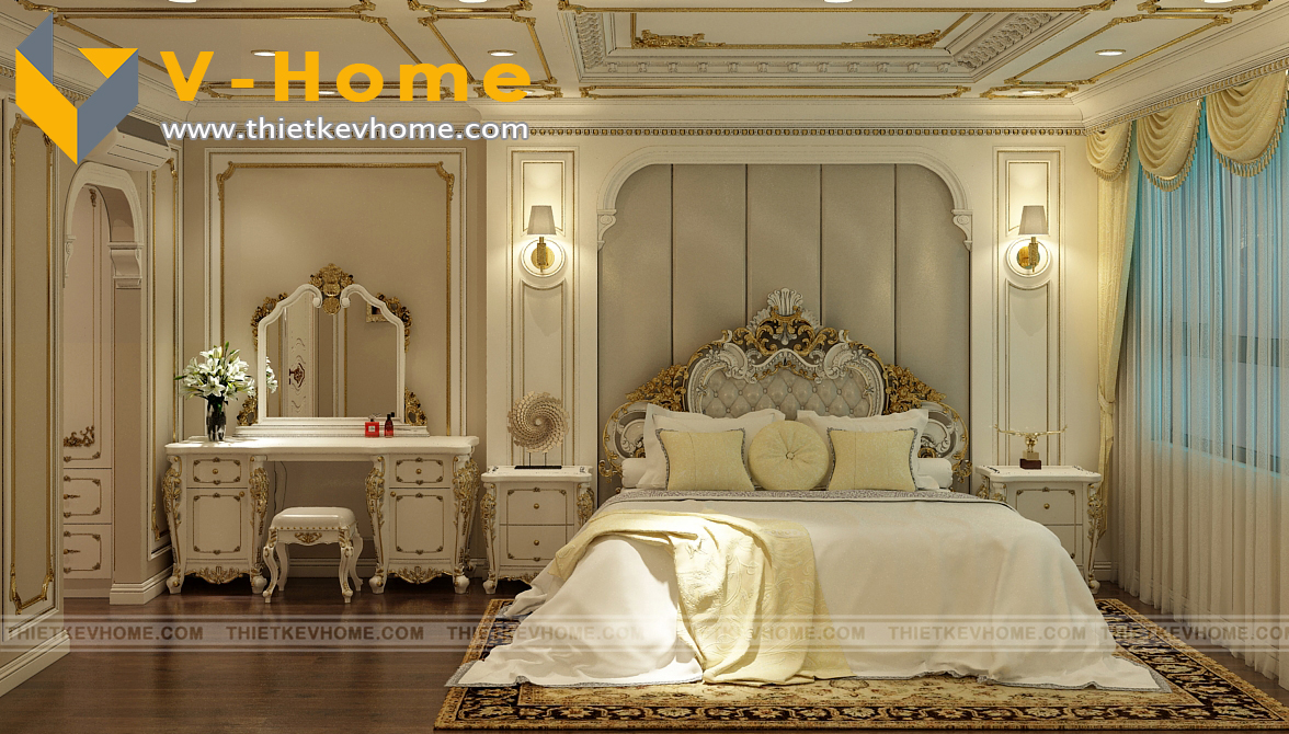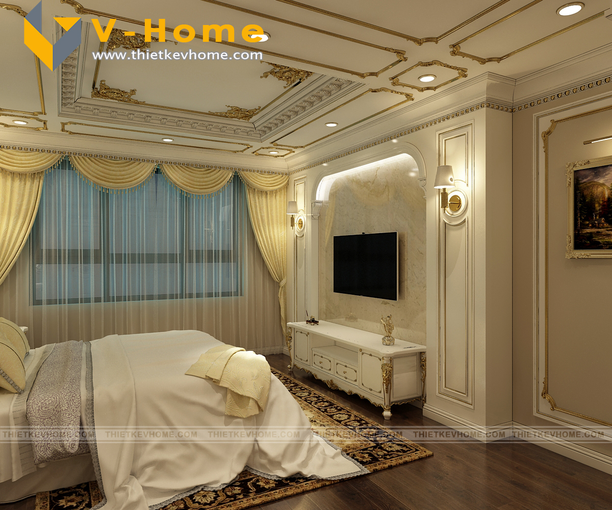 Thiết kế nội thất phòng ngủ master theo phong cách tân cổ điển mang lại một không gian hưởng thụ đúng nghĩa. Nội thất tân cổ điển với màu chủ đạo là trắng, không chỉ mang lại một cảm giác yên bình, sang trọng và tinh tế mà nó còn giúp cho không gian của bạn có cảm giác rộng hơn và tươi mát hơn. Áng sáng vàng lại mang lại cảm giác ấm cúng cho không gian phòng ngủ.