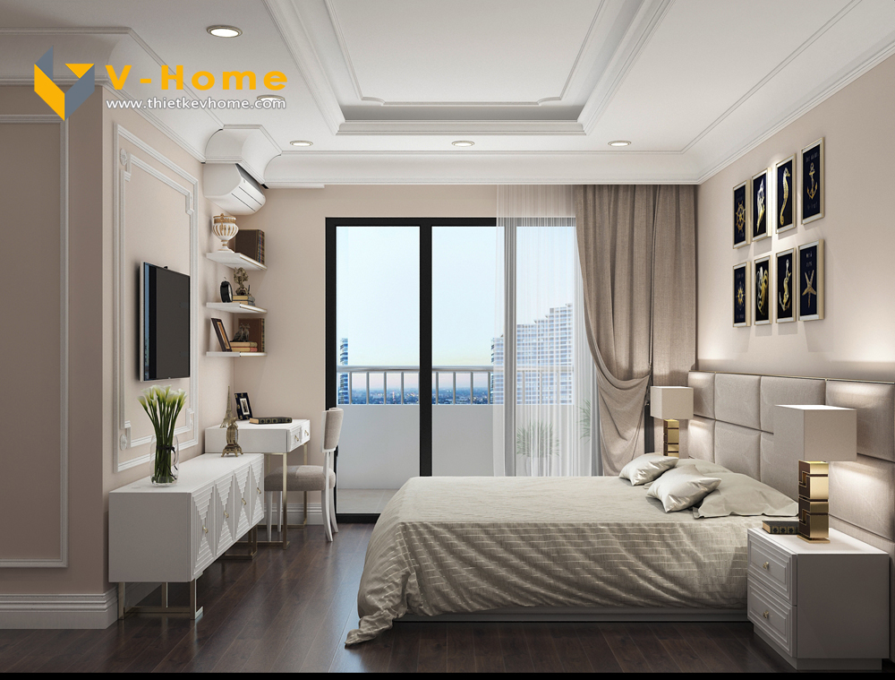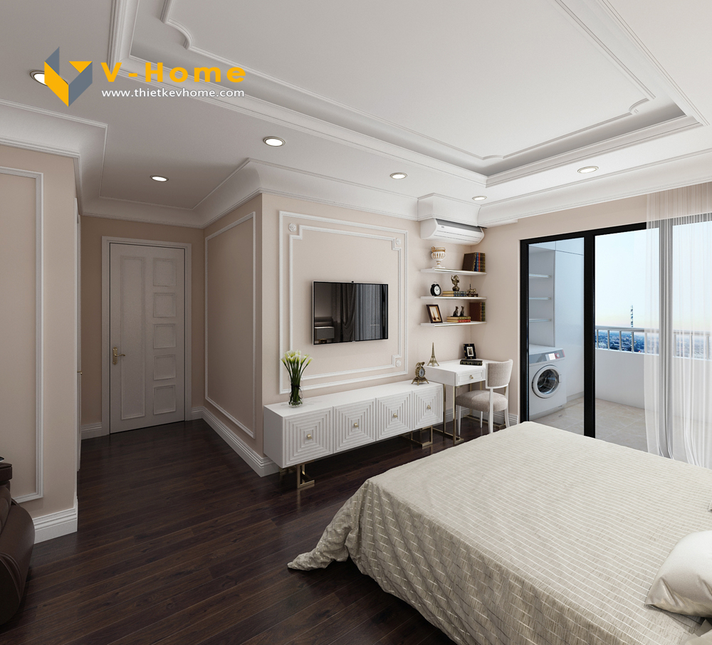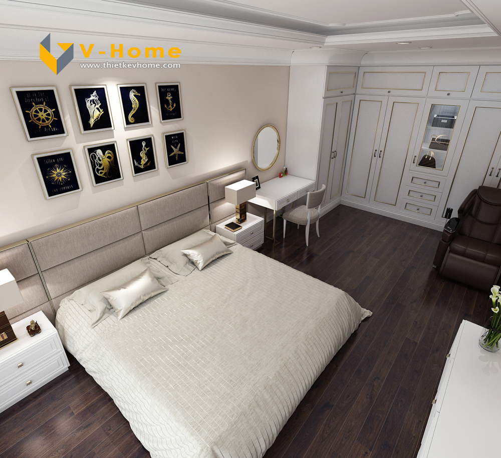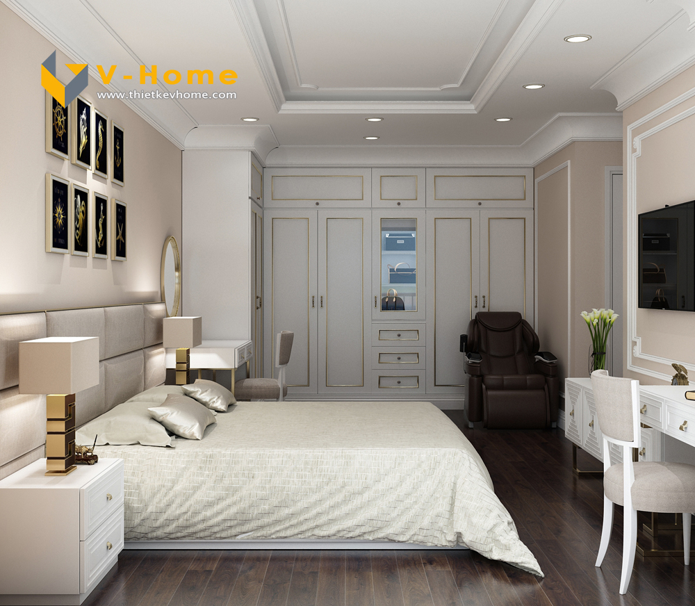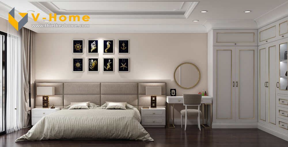 Thiết kế phòng ngủ master theo phong cách Tân cổ điển không quá đi vào chi tiết cầu kì như phong cách Cổ điển truyền thống mà chỉ đi vào chi tiết nhấn nhá, vừa tạo không gian hoàng gia, vừa mang lại vẻ đẹp phù hợp với thời gian.