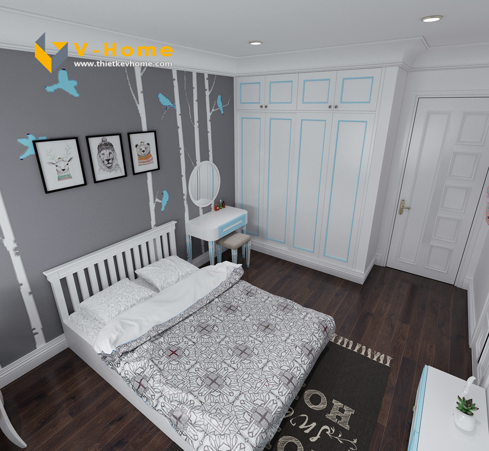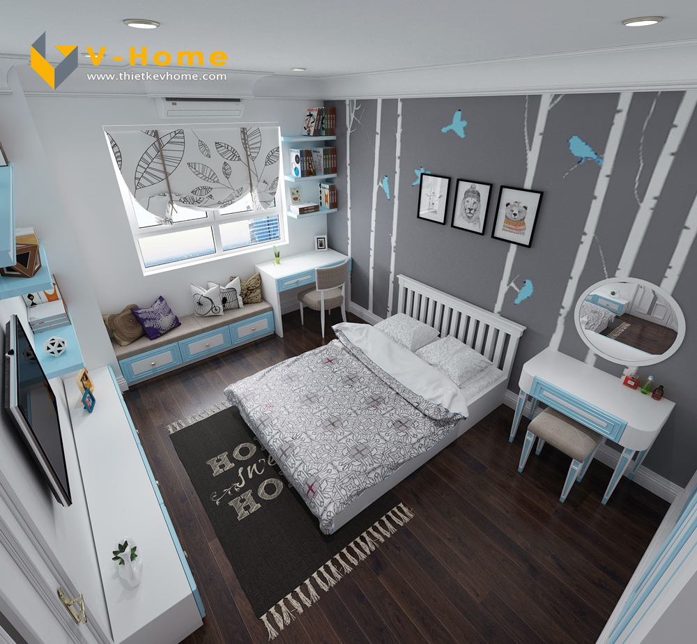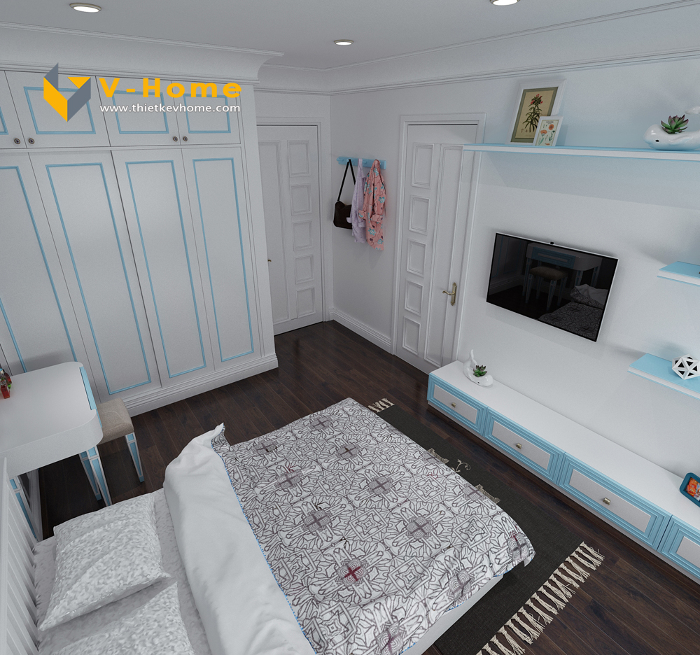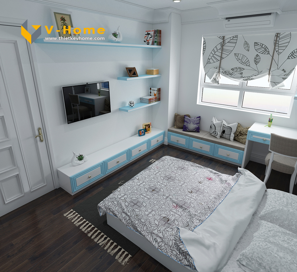 Thiết kế nội thất phòng ngủ con trai với tông màu xanh nhẹ nhàng, bình yên kết hợp với màu trắng tinh khôi, lịch sự.