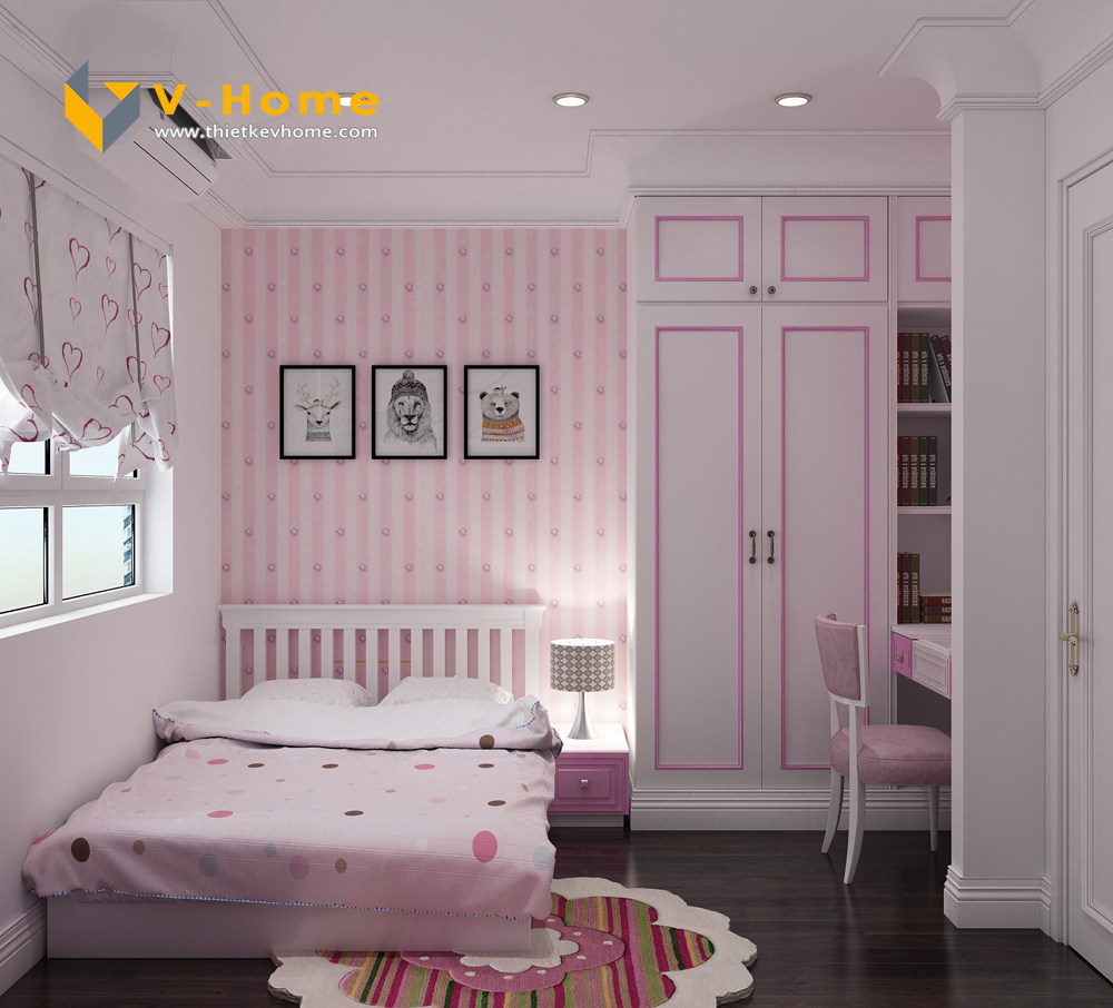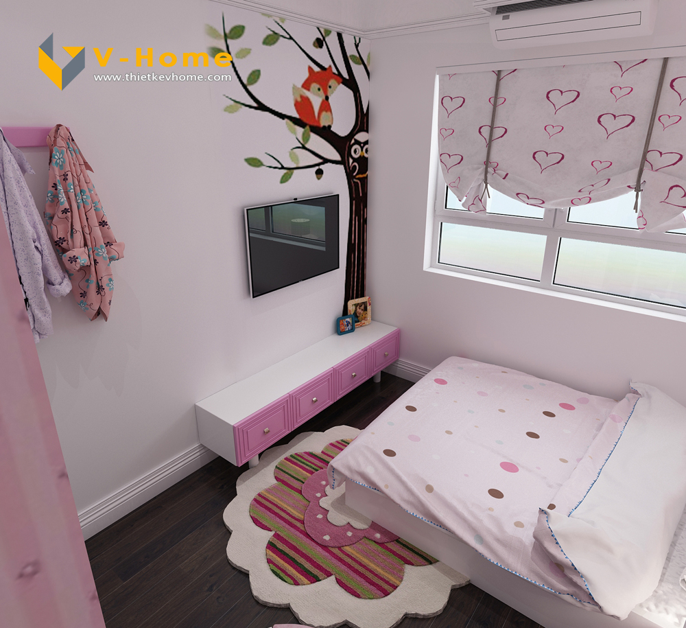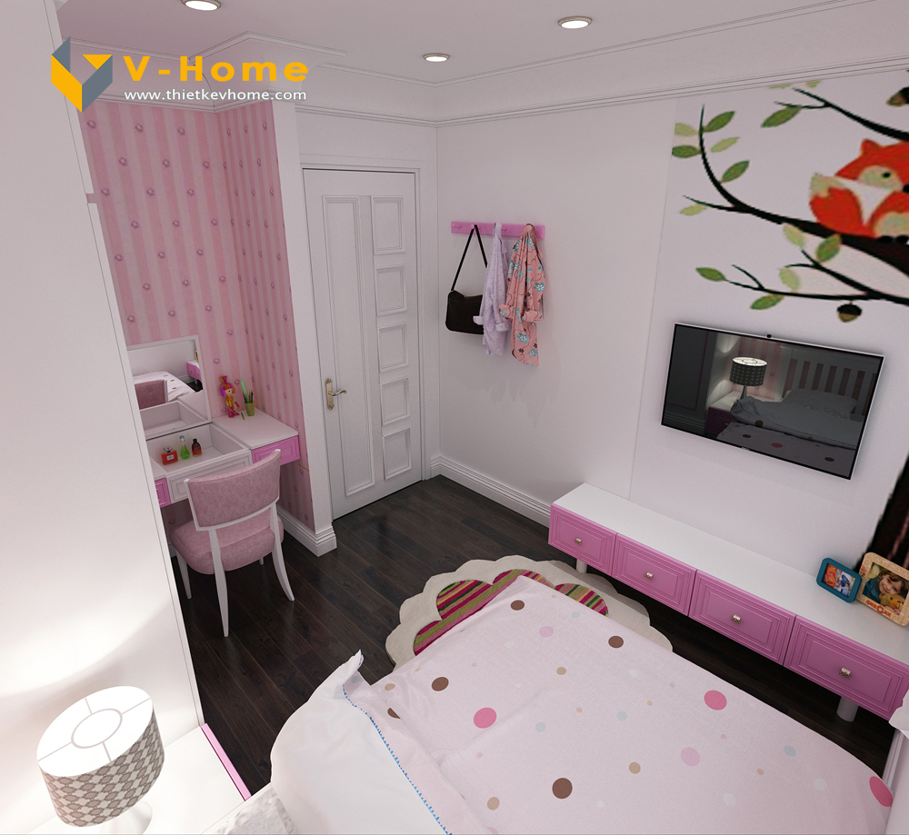 Thiết kế phòng ngủ con gái lại mang tới một không gian vô cùng dễ thương với màu hồng tím baby, đáng yêu hết nấc. Không gian phòng ngủ không quá rộng rãi nhưng vẫn đầy đủ công năng cho cô công chúa bé nhỏ của bố mẹ.