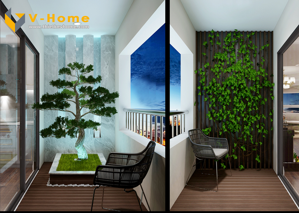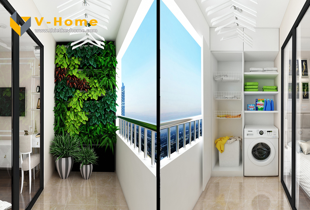 Thiết kế logia với hàng cây giả mang lại khoảng không gian màu xanh cho cuộc sống gia đình, làm dịu bớt cái gay gắt của nắng hè, tâm hồn người cũng vì thế mà thư thái hơn. Tủ đựng máy giặt cũng được thiết kế với nhiều ngăn để gia chủ có thể phân loại quần áo, dễ dàng cho việc giặt là.
