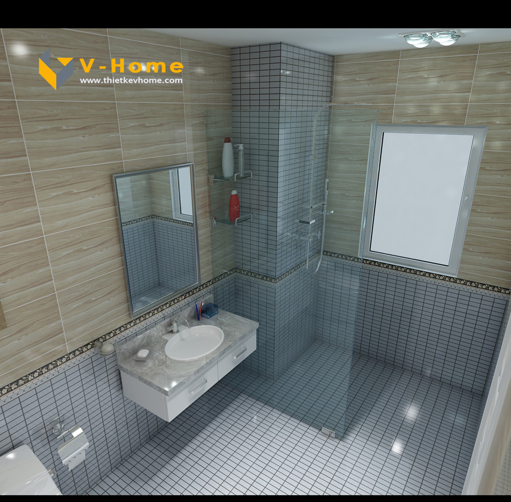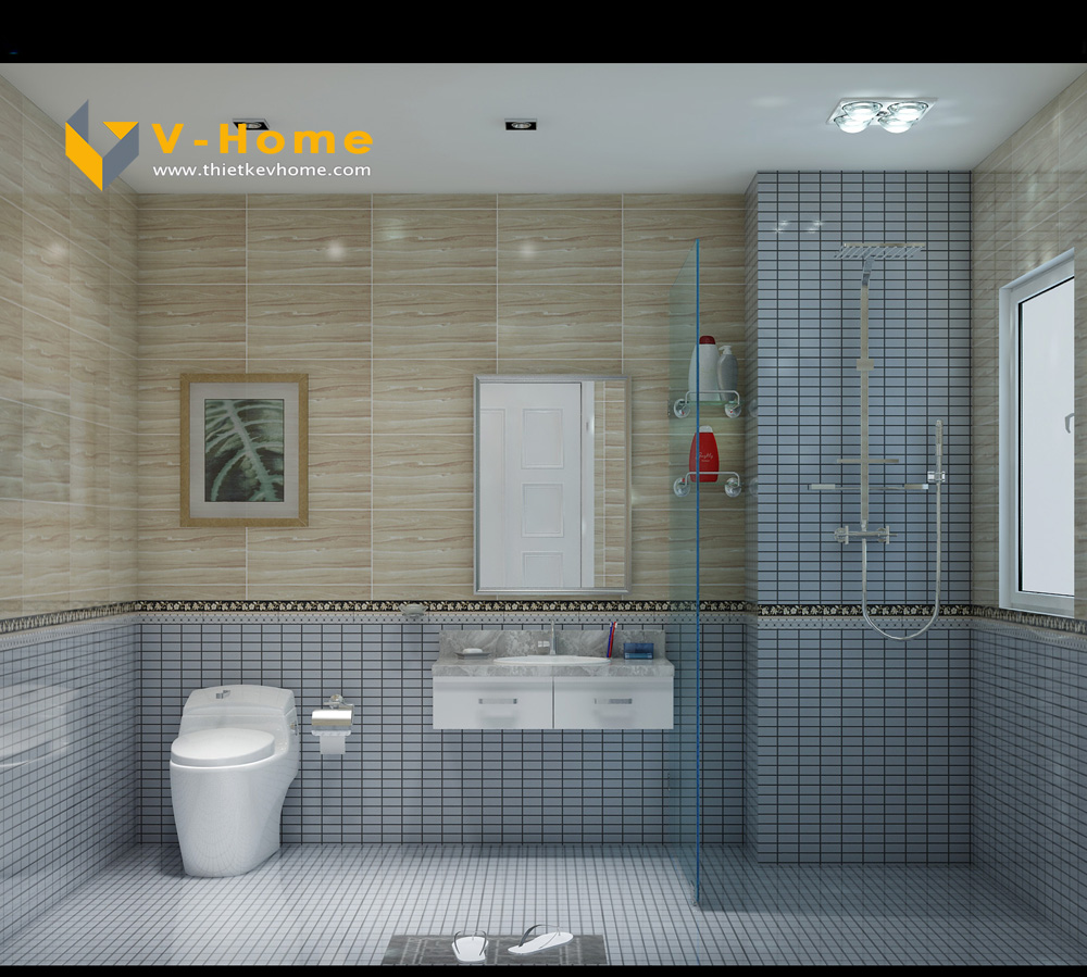 Thiết kế phòng WC của phòng ngủ con trai cũng sử dụng ốp đá màu xanh, cho thấy sự thống nhất trong phong cách thiết kế.