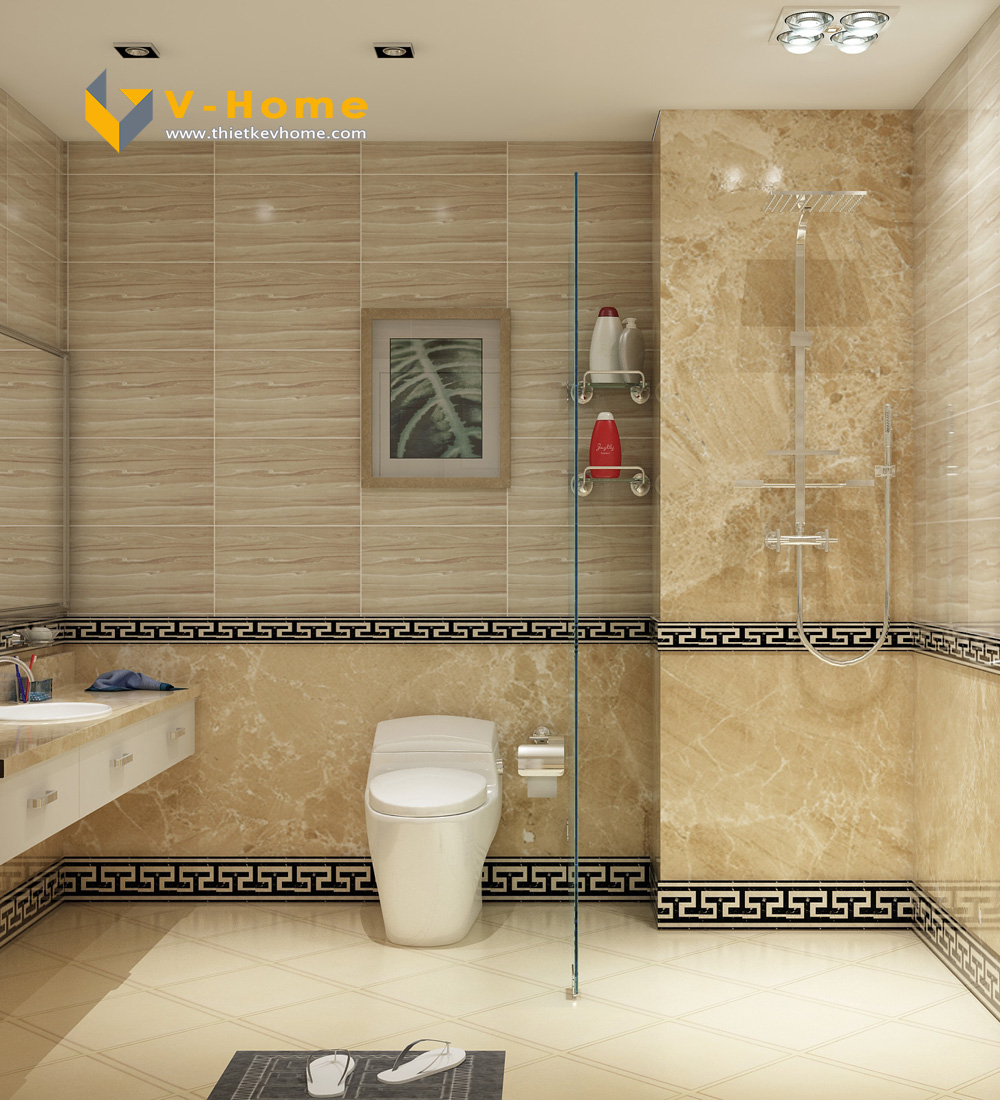 Thiết kế nhà vệ sinh ốp đá màu nâu cuội vừa sang trọng vừa sạch sẽ. Cùng với họa tiết trang trí tạo điểm nhấn giống phòng khách, thiết kế phòng vệ sinh rộng rãi tạo cảm giác thư thái cho gia chủ khi sử dụng.
