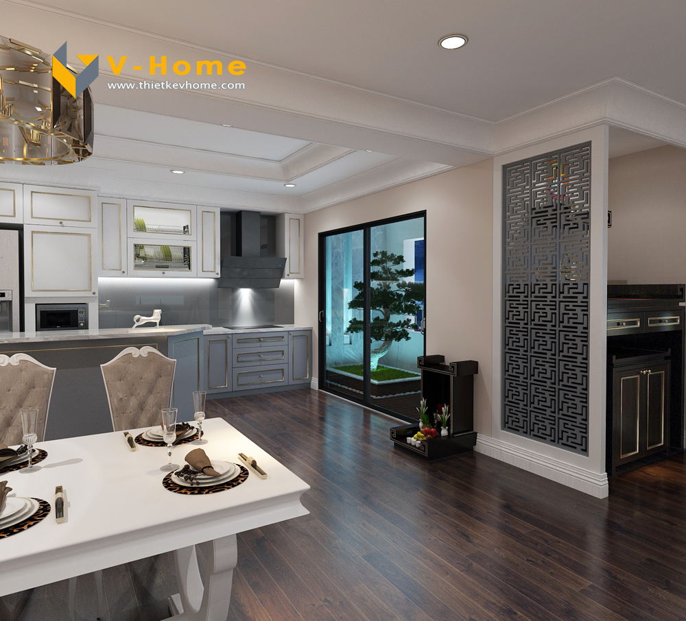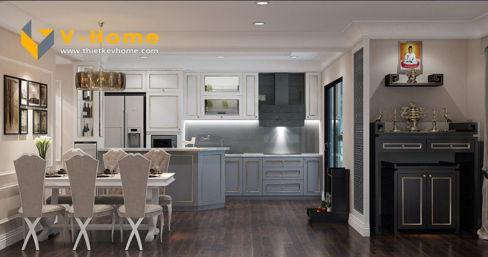 Ban thờ được ngăn cách với không gian phòng bếp bởi vách CNC. Theo phong thủy Việt Nam, vách CNC giúp ngăn cách thông gian vừa ngăn chặn các khí xấu, mang lại tài lộc cho gia chủ, vừa khiến không gian trở lên thông thoáng hơn. Ngoài ra, gia chủ còn muốn đặt ban thờ thần tài, thổ địa ở ngay cửa ra vào, cầu tài lộc và bình an gia chủ.