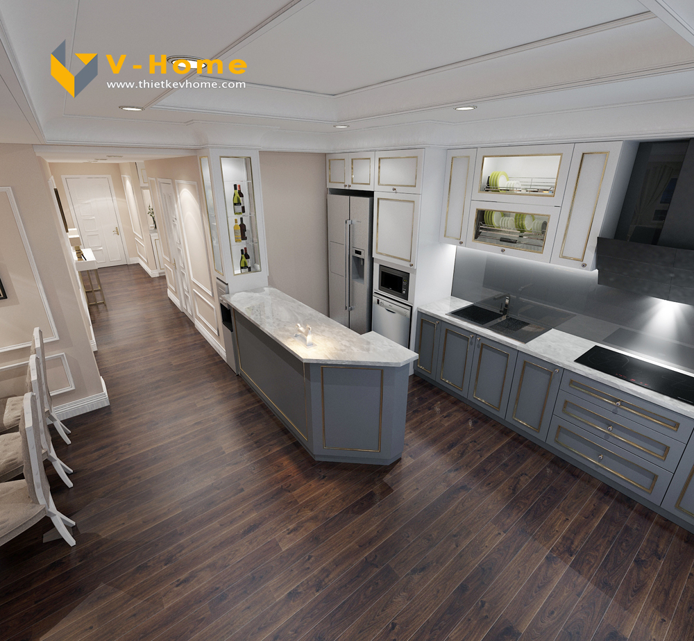 Thiết kế phòng bếp rộng với bàn bar khiến khu bếp trở lên sang trọng và đẳng cấp hơn. Các nội thất tân cổ điển nổi bật với các đường phào chỉ được mạ vàng tạo điểm nhấn hoàn hảo cho không gian sinh hoạt của gia đình.
