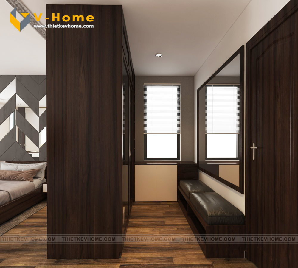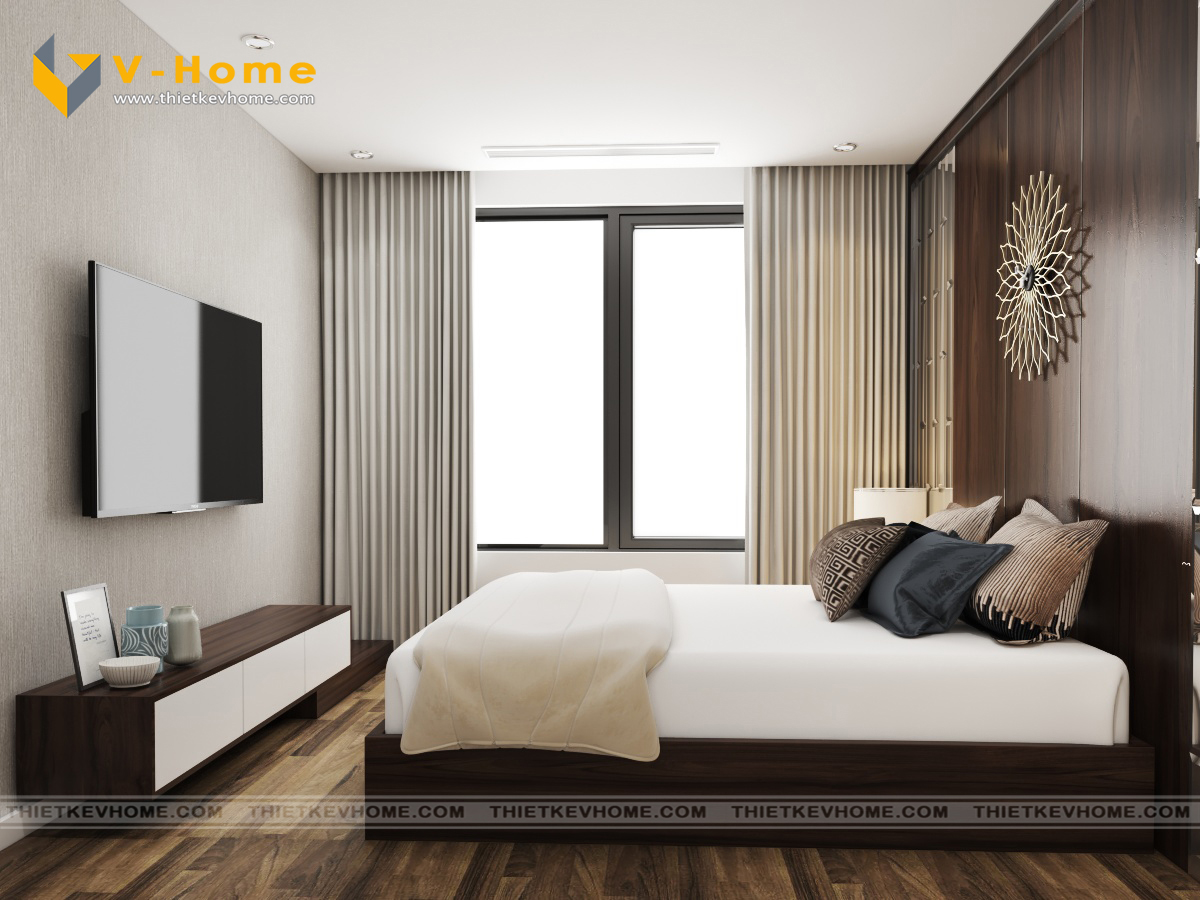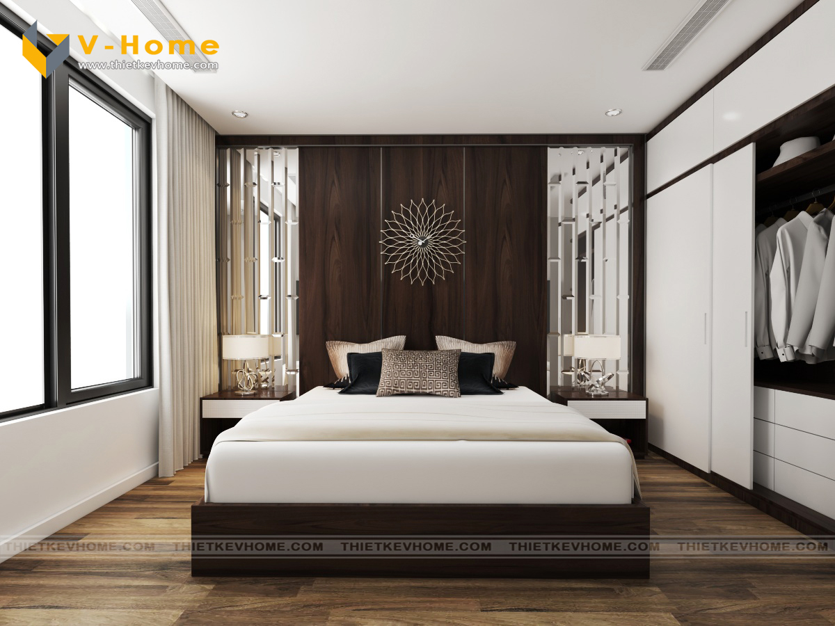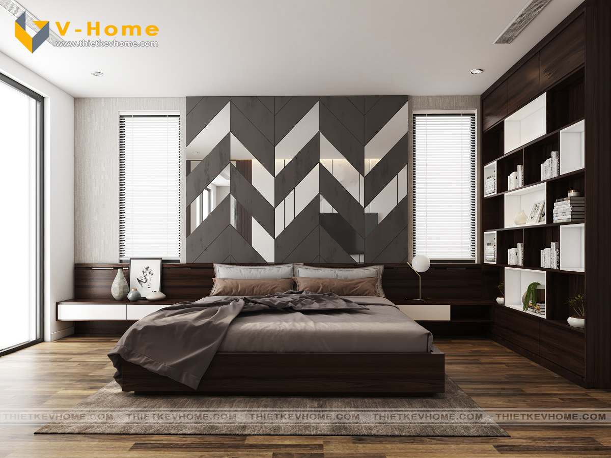 Thiết kế nội thất phòng ngủ master vẫn là sự kết hợp giữa màu nâu cà phê của gỗ và sắc xám của vách ốp đầu giường cách điệu mang đến không gian nghỉ ngơi yên bình và ấm cúng cho gia chủ. Phòng ngủ được bố trí nội thất đơn giản mà vẫn tinh tế, hiện đại và tiện nghi.