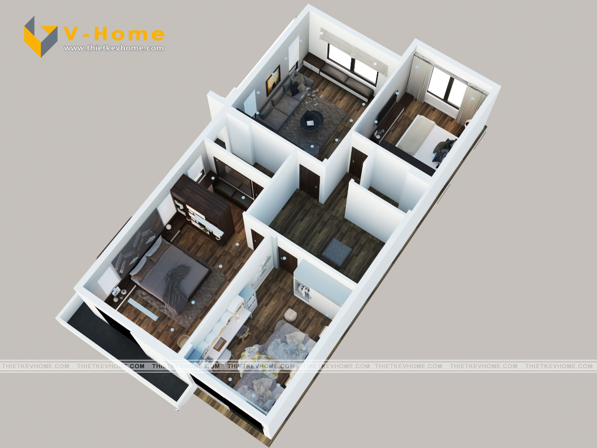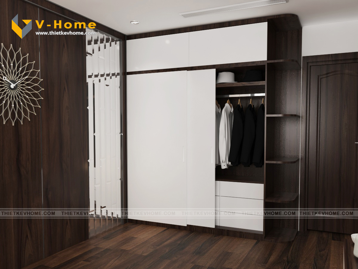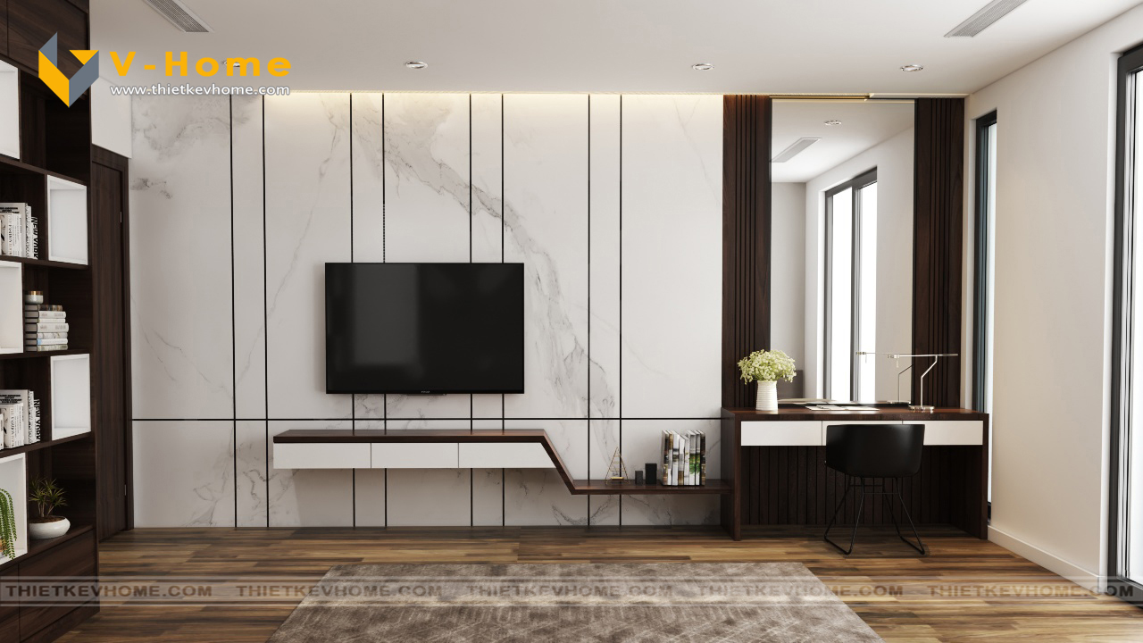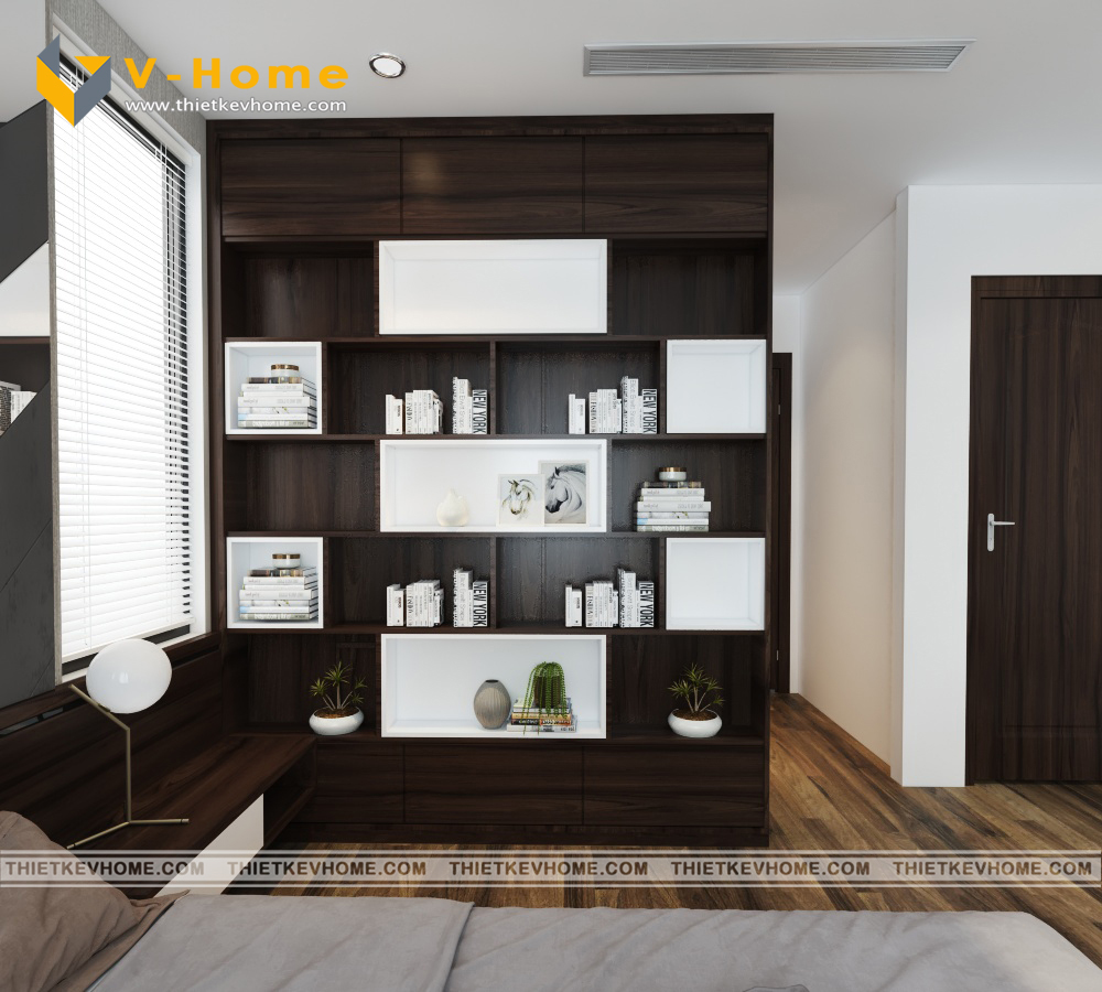 Thiết kế nội thất phòng ngủ master vẫn là sự kết hợp giữa màu nâu cà phê của gỗ và sắc xám của vách ốp đầu giường cách điệu mang đến không gian nghỉ ngơi yên bình và ấm cúng cho gia chủ. Phòng ngủ được bố trí nội thất đơn giản mà vẫn tinh tế, hiện đại và tiện nghi.