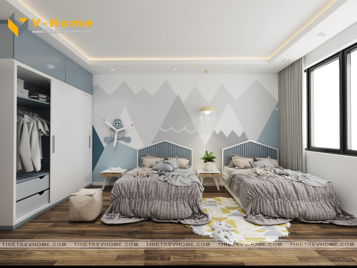Nội thất phòng ngủ con được trang trí với tone màu xanh pastel mang lại một không gian sống dịu nhẹ, bình yên, mát mẻ và kiểu cách. Màu xanh mang lại sự tươi mới, cảm giác yêu đời cho người sử dụng và ngắm nhìn nó.