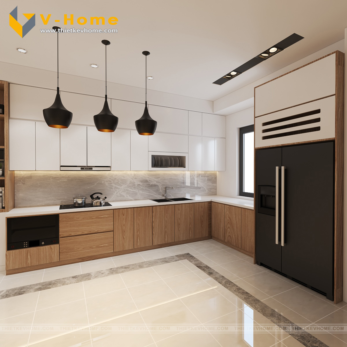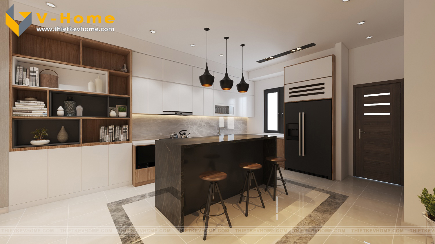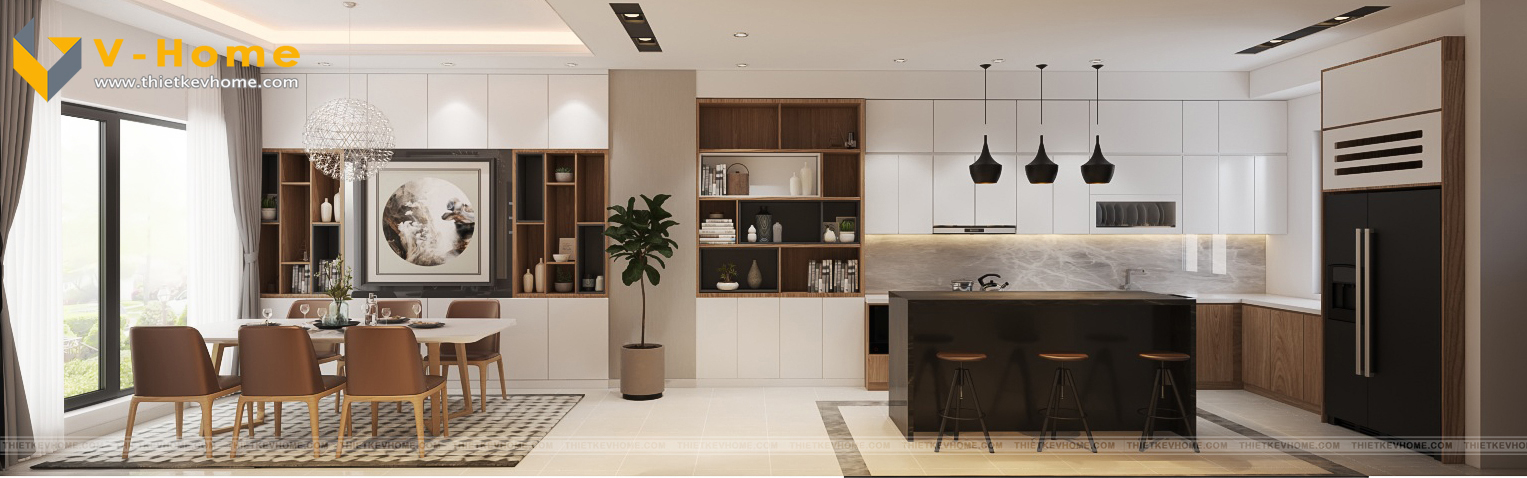 Thiết kế không gian phòng bếp và phòng ăn liền kề là dụng ý của kiến trúc sư VHome. Với thiết kế không gian mở này, không gian sống của gia đình trở lên liền mạch, thuận tiện góp phần gắn kết các thành viên trong gia đình. Nội thất bếp và nội thất phòng ăn liền kề cho thấy sự khôn khéo trong sắp xếp bố trí công năng hợp lý của các kiến trúc sư dày dặn kinh nghiệm.