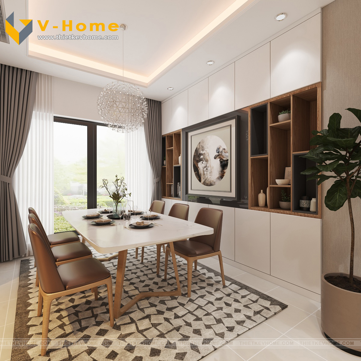 Thiết kế nội thất phòng ăn khách hàng cũng như kiến trúc sư VHome thiết kế khá nhiều hệ tủ, các hệ tủ vừa có tác dụng trang trí vừa là kho lưu trữ đồ, tạo thói quen ngăn nắp, gọn gàng cho các thành viên trong gia đình. Gia chủ sẽ không phải tốn diện tích một phòng thành kho chứa đồ. Hệ tủ trang trí phòng ăn cũng là được thiết kế đặc biệt với sự kết hợp của màu gỗ ấm áp và màu trắng tinh khiết, nhưng có chút nhấn nhá bởi sắc xám tạo sự thu hút, và thi vị.