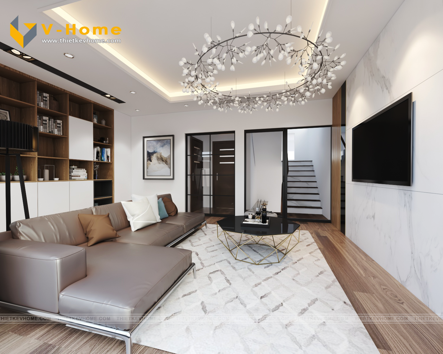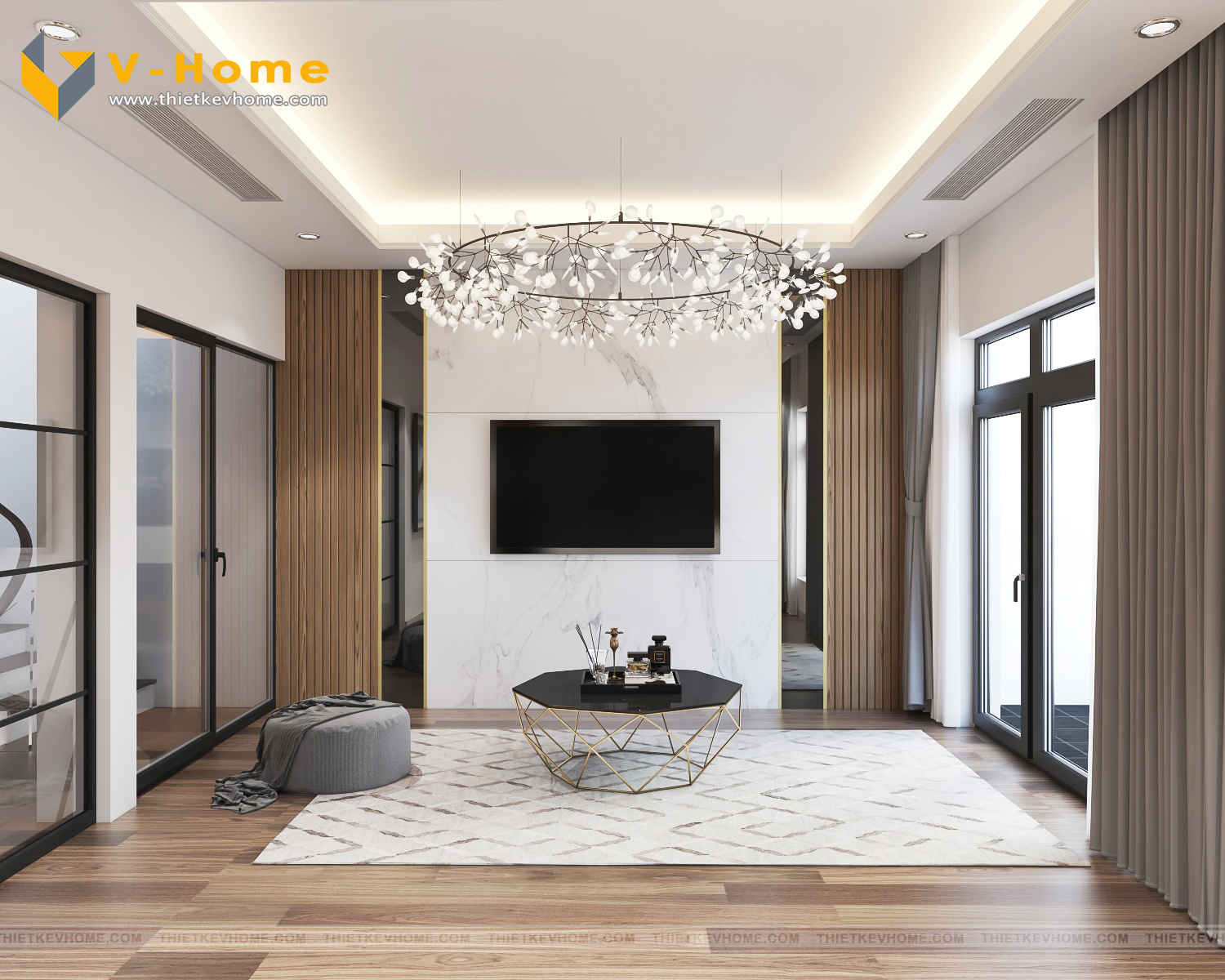 Trần thạch cao phòng khách được thiết kế giật cấp sử dụng hệ thống đèn tuýp T5 ánh sáng vàng tạo điểm nhấn cho không gian nội thất nơi đây. Với thiết kế nội thất cao cấp, kiến trúc sư V-Home đã tìm hiểu và sử dụng các vật liệu cao cấp, đề cao tính thẩm mĩ và độ bền của vật liệu. Vách ốp sau ti vi sử dụng đá marble tự nhiên quắc vân, xóa bỏ sự đơn điệu của những bức tường và toát lên vẻ sang trọng của không gian sống, độ chịu chơi của gia chủ.