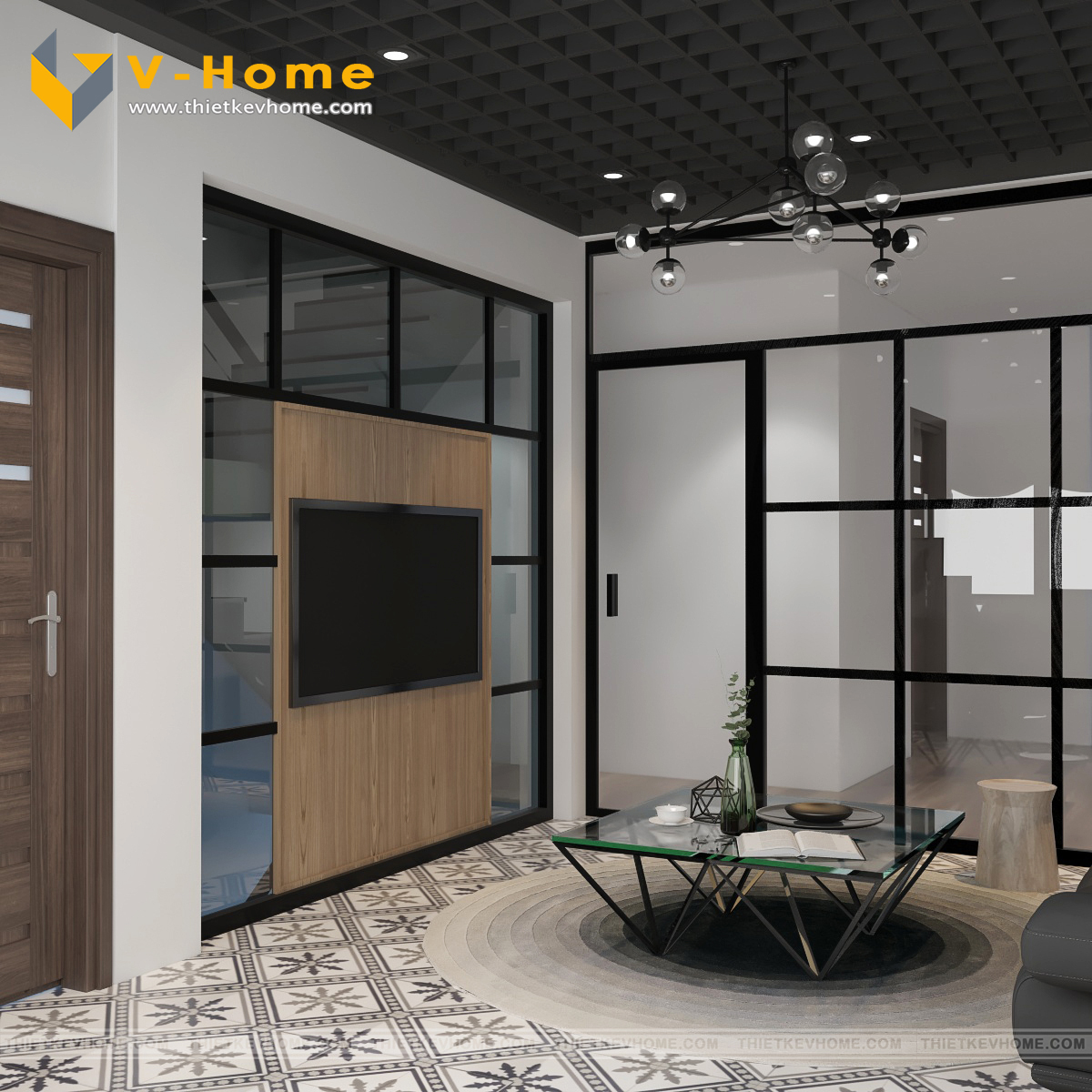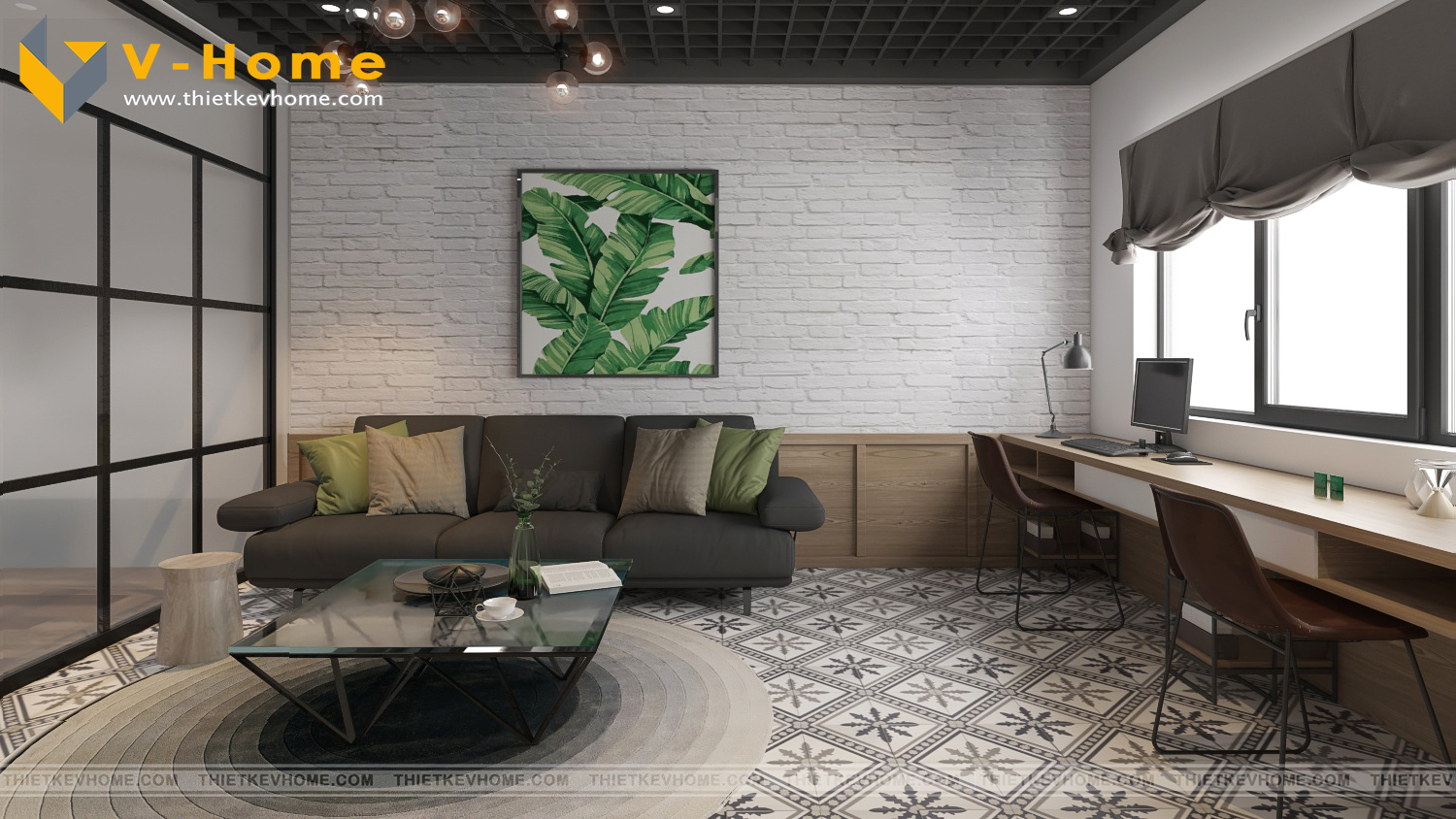 Phòng làm việc được thiết kế khá đặc biệt so với các không gian chức năng khác. Kiến trúc sư VHome sử dụng trần nhôm và sàn nhà lát gạch bông tạo sự khác biệt, mang lại cảm hứng làm việc và học tập. Tại phòng làm việc được bố trí bộ sofa để gia chủ có thể ngả lưng thư giãn xem ti vi sau những giờ tập trung căng thẳng hoạt động trí óc.