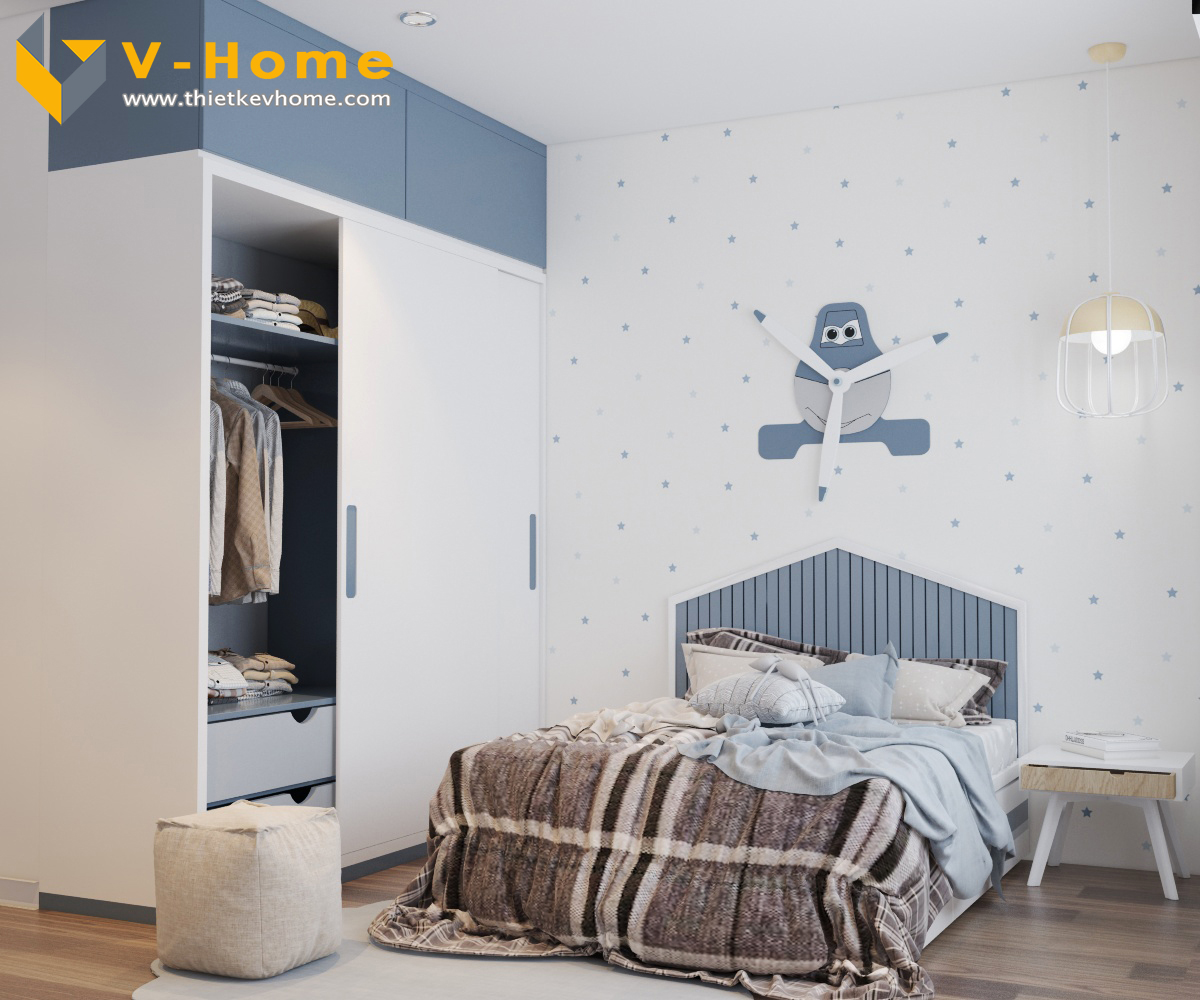 Thiết kế nội thất phòng ngủ trẻ, kiến trúc sư luôn chọn màu sáng tươi sáng phù hợp với lứa tuổi trẻ thơ hồn nhiên, đáng yêu. Phòng ngủ trẻ con này với gam màu trắng và xanh kết hợp hài hòa tạo thành một chỉnh thể thống nhất. Màu xanh pastel mang lại cho không gian nội thất sự bình yên, nhẹ nhàng và mát mẻ. Màu xanh luôn mang cho con người cảm giác thư thái và dễ chịu, nhất là những hôm mùa hè trở nóng.