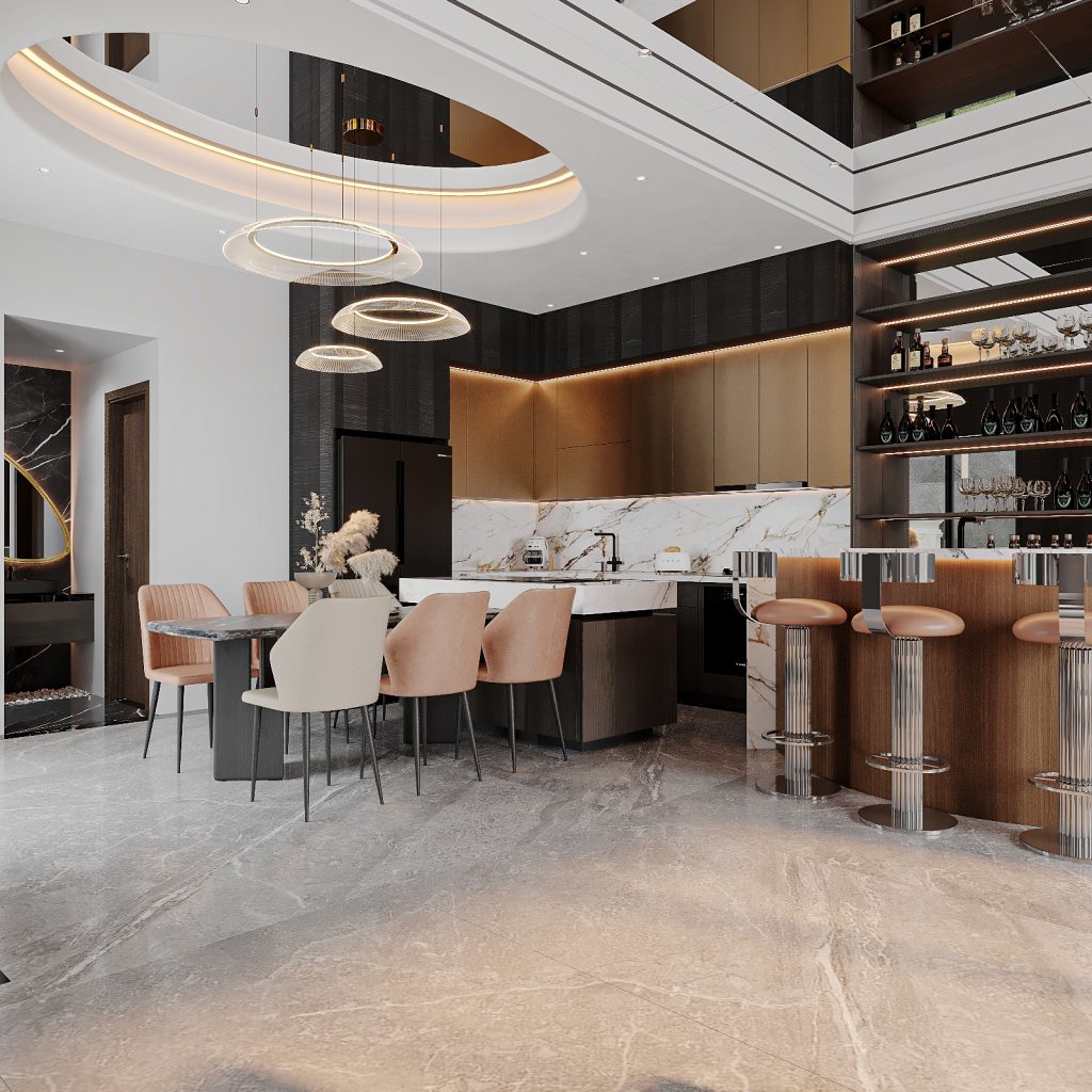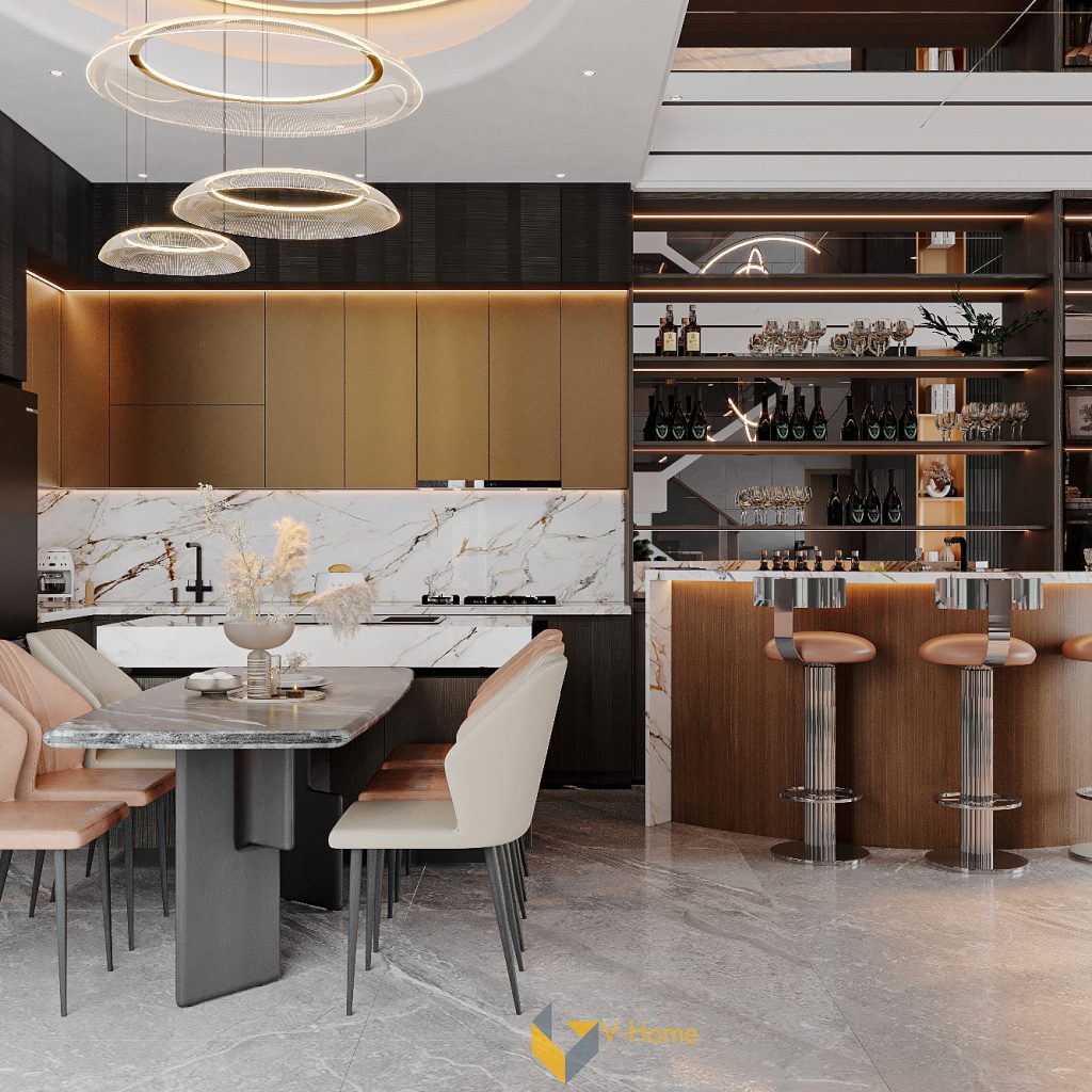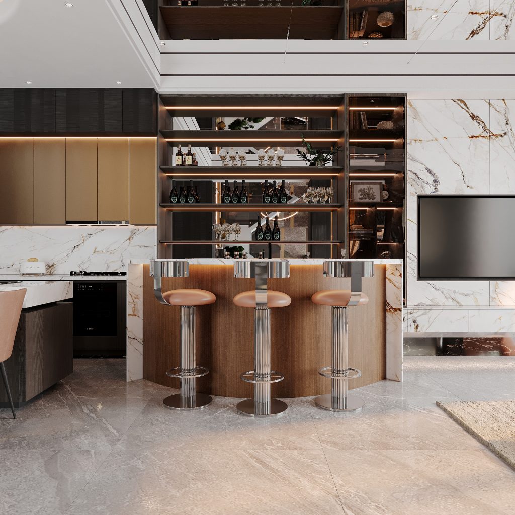 Thiết kế quầy mang tinh thần hiện đại pha chút retro, với ghế chân trụ inox, mặt quầy ốp đá marble đồng bộ với bếp, và hệ kệ trưng bày rượu – ly thủy tinh được chiếu sáng nhẹ bằng đèn LED âm tủ.