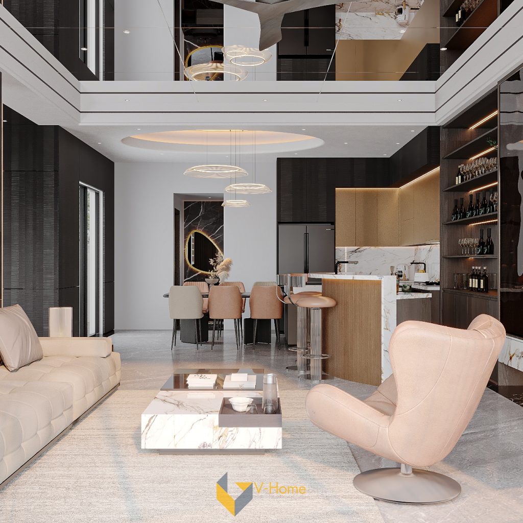 Khu vực sảnh, phòng khách và bếp được chúng tôi thiết kế mở liên hoàn, giúp ánh sáng tự nhiên tràn ngập và mang lại sự thông thoáng. Các mảng tường được V-Home xử lý bằng vật liệu cao cấp tạo nên nhịp điệu vật liệu thống nhất nhưng không đơn điệu. Nhờ sự tính toán tỉ mỉ của đội ngũ thiết kế, từng góc nhìn đều trở thành một khung hình nghệ thuật, phản chiếu phong cách sống hiện đại, đẳng cấp.