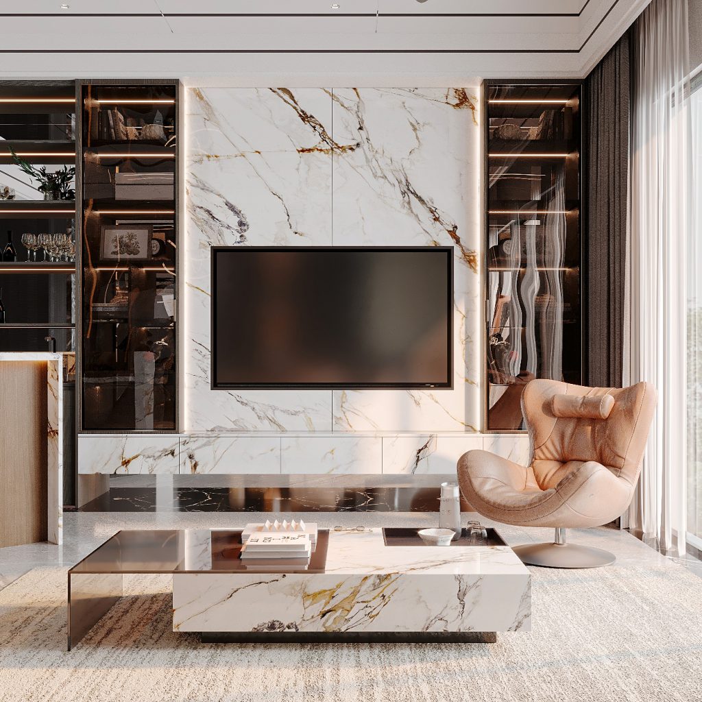 Khi bước chân vào phòng khách ta có thể thấy được sự tràn ngập ánh sáng tự nhiên nhờ hệ cửa kính lớn full trần. Bộ sofa da màu kem kết hợp ghế đơn cong mềm mại tạo cảm giác thoải mái và thanh lịch. Bàn trà và mảng tường TV được ốp đá marble đồng bộ, tôn lên sự thống nhất và cao cấp của toàn không gian.