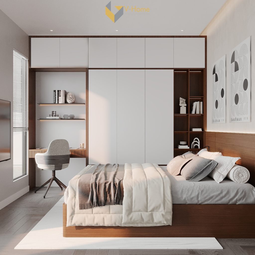 - Tủ quần áo âm tường cao kịch trần tích hợp kệ trang trí mở và bàn làm việc liền khối, tạo sự liền mạch và tiết kiệm diện tích.