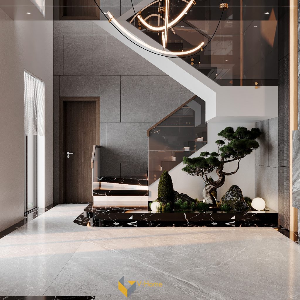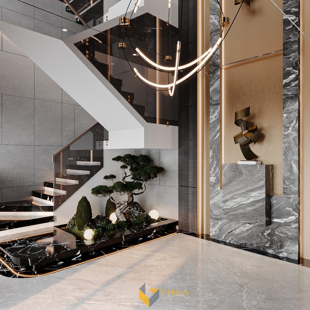 Ngay dưới gầm cầu thang, tiểu cảnh bonsai được bố trí khéo léo – một khoảng xanh tĩnh lặng giữa những vật liệu sang trọng. Cây tùng dáng nghệ thuật cùng đá và đèn tròn chiếu sáng nhẹ tạo nên không gian thiền Zen, dung hòa giữa tính hiện đại và hơi thở tự nhiên phương Đông.